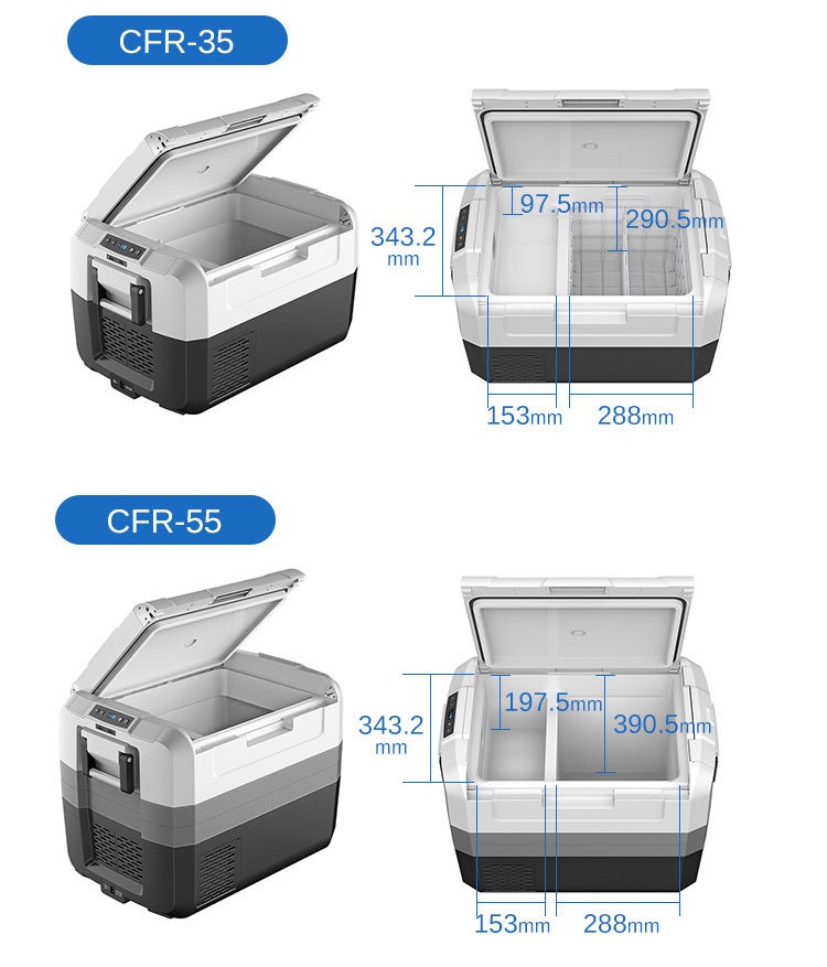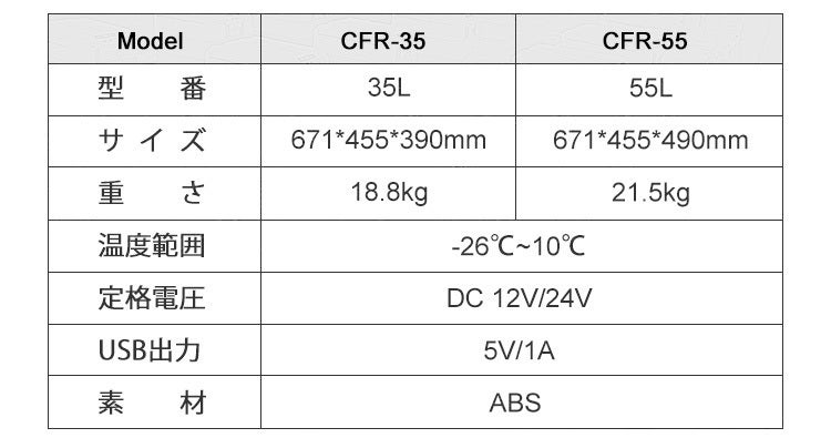 一番スマートな35Lなら、SUV車のトランクはもちろん、普通乗用車のトランク、トラックの運転席などにもお使いいただけます。55Lの大容量タイプなら、トランクが広くて、高さ制限のないSUV車や軽自動車、またはご自宅のサブ冷蔵庫としての使用もおすすめです。