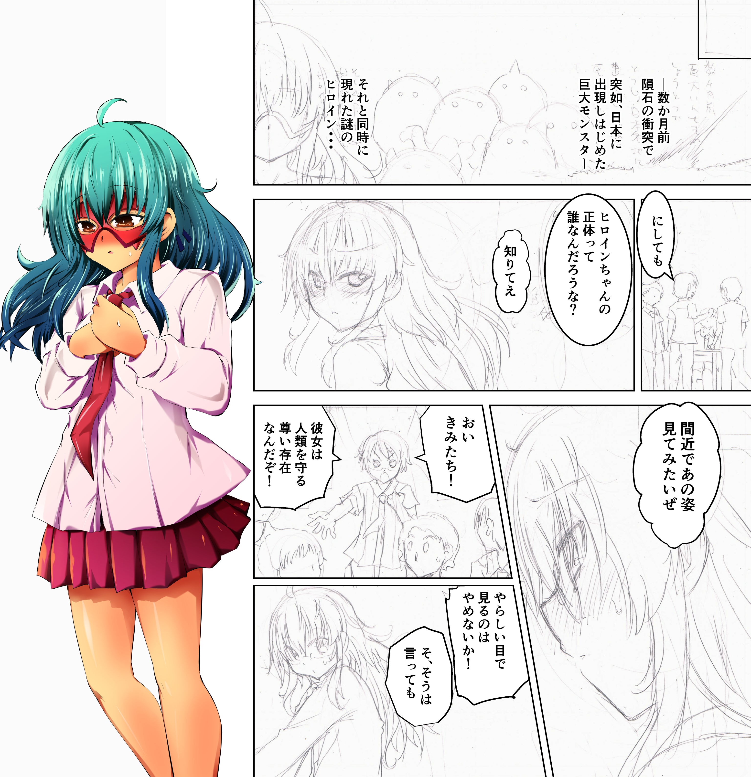 ヒーローもの『解放ヒロイン(仮)』のあらすじは・・・突如出現した巨大モンスター、そこに正義のヒーローが登場。彼女は常識とは外れた身体能力を持っていて、その溢れ出る力を抑えるために普段は特殊な繊維で作られた服で抑えている。モンスターと戦うときにその力を開放する・・・