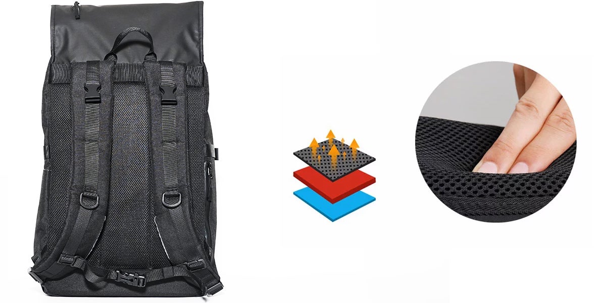 エルゴノミック(人体工学)に基づいたS型のストラップはストレスを軽減し、背中にフィットするよう設計されています。長時間背負っても疲れにくい独特なデザインのパッドを使用しています。