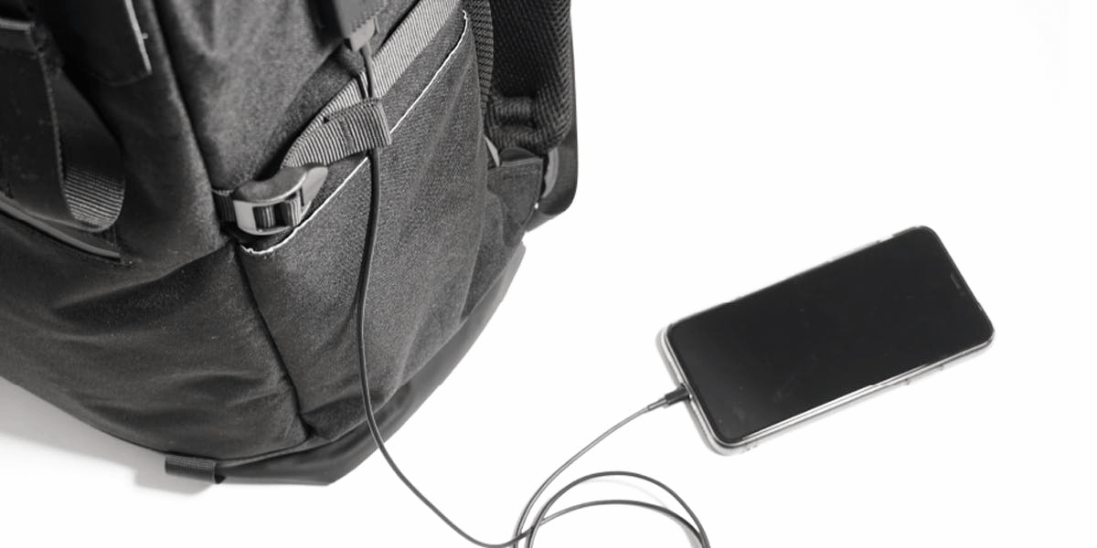 お手持ちのモバイルバッテリーをリュックの内側から接続しておくだけで、モバイル機器はいつでもどこでも、スマートフォンその他のデバイスを簡単に充電しながらスマートフォンを操作できます。