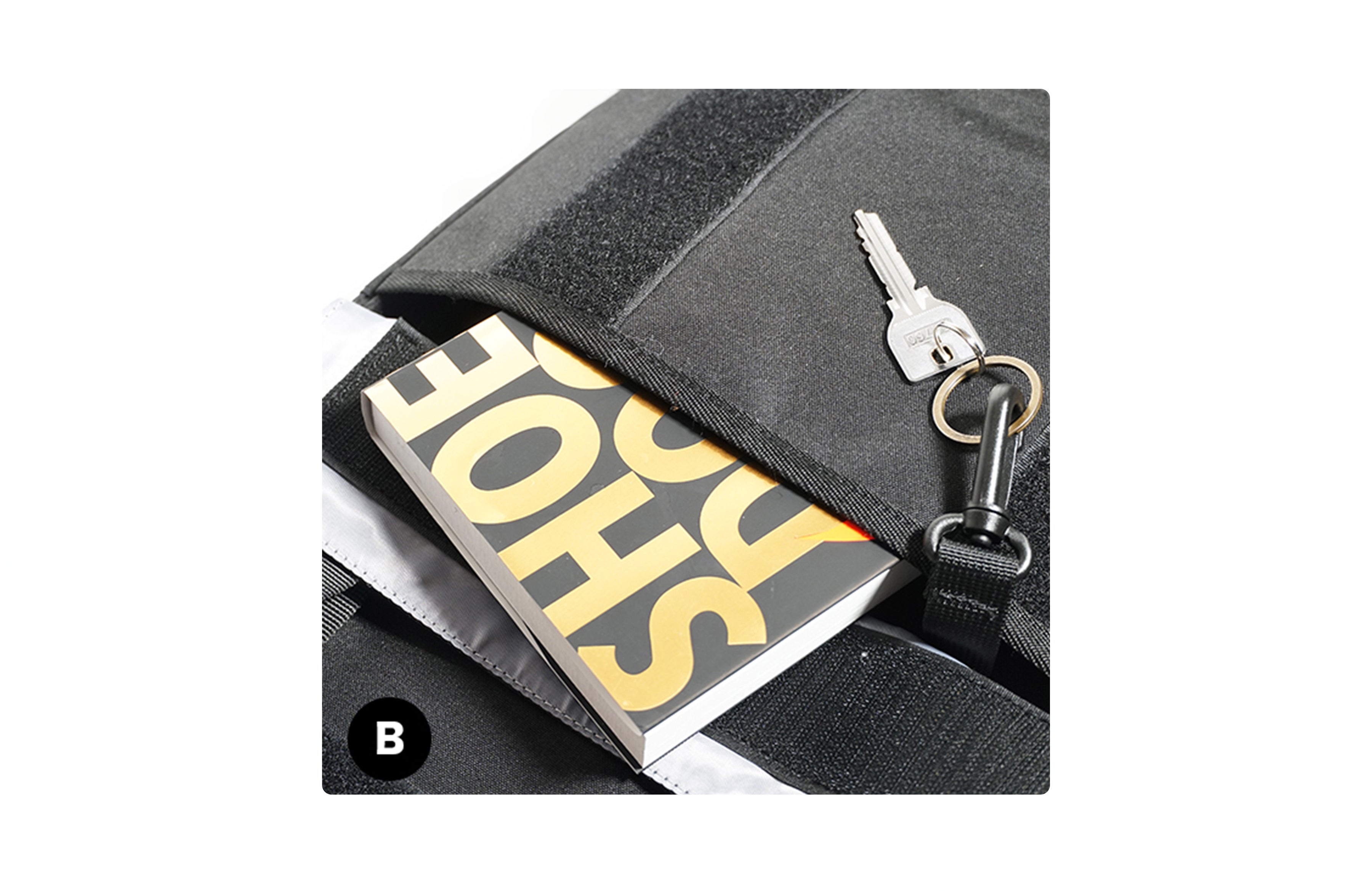 収納B:外ポケット 雑誌が6冊も入り、鍵もひっかけられるフック付き。