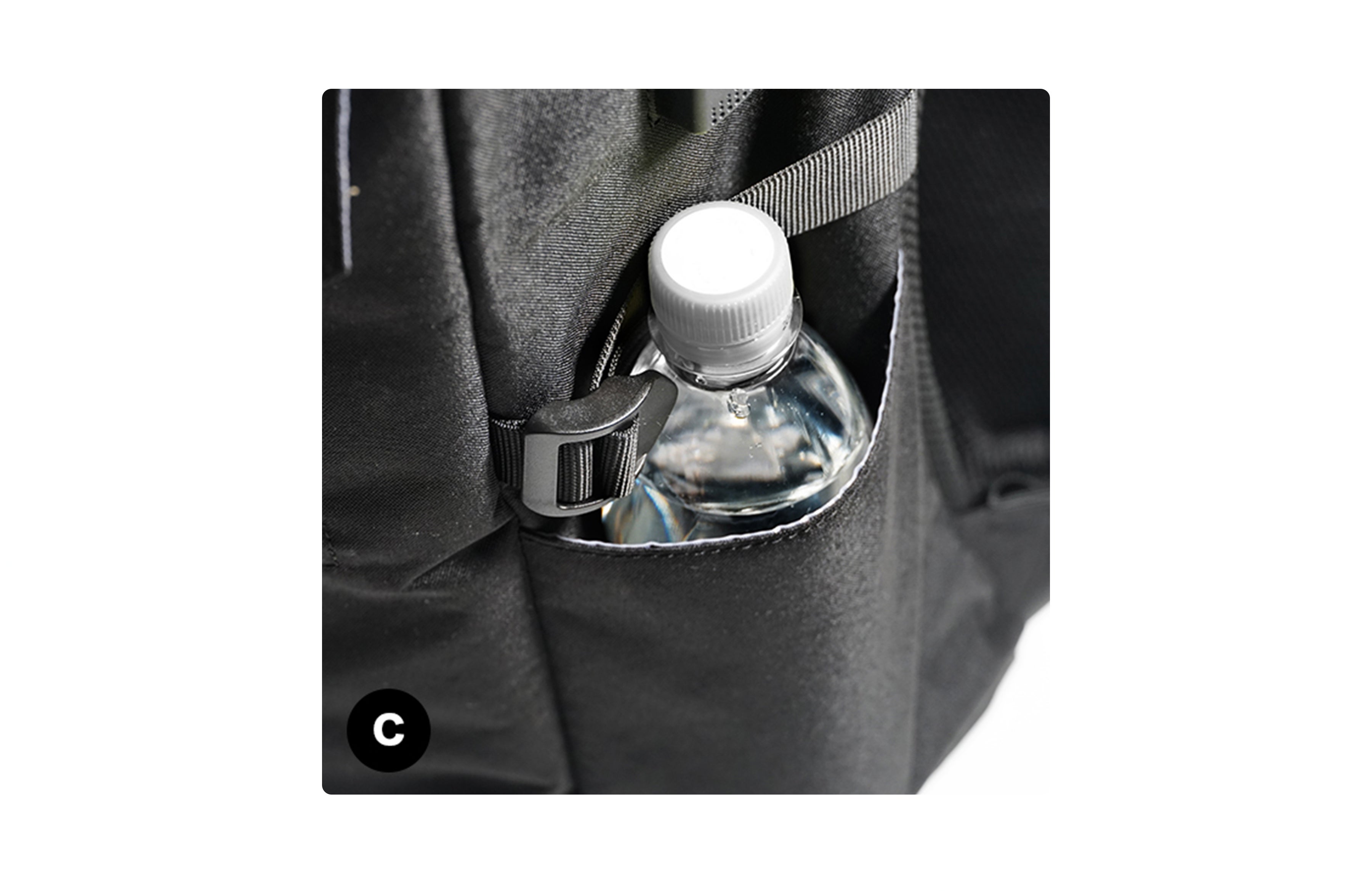 大きめのサイドポケットは500㎖のペットボトルや水筒などしっかり収まります。