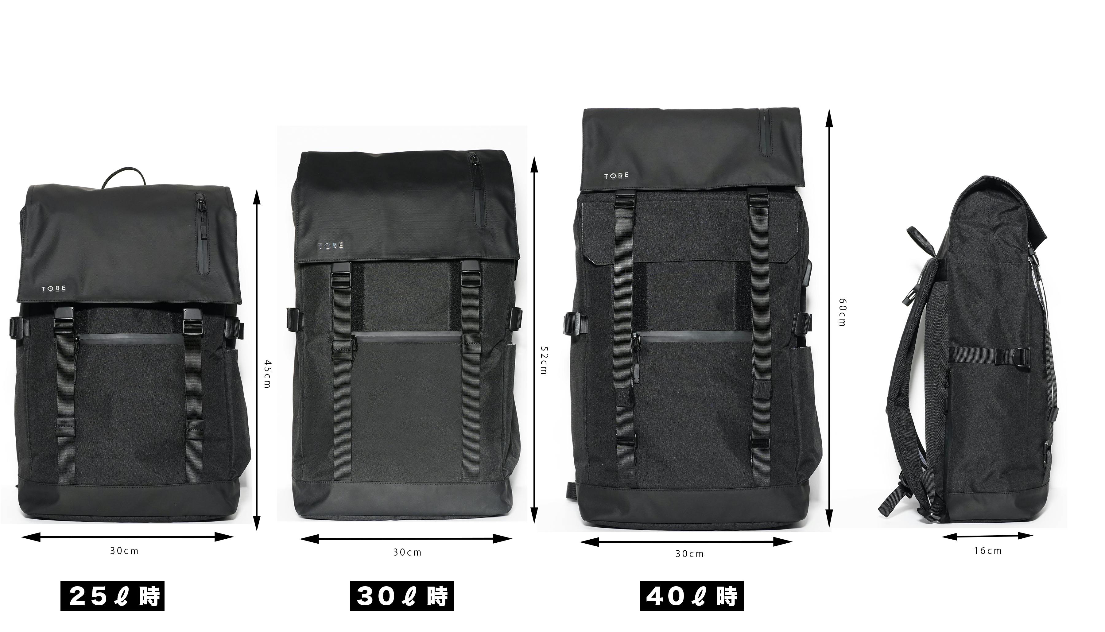 今回は縦に伸びるバックパック。25ℓから40ℓまで自在に調整可能です。