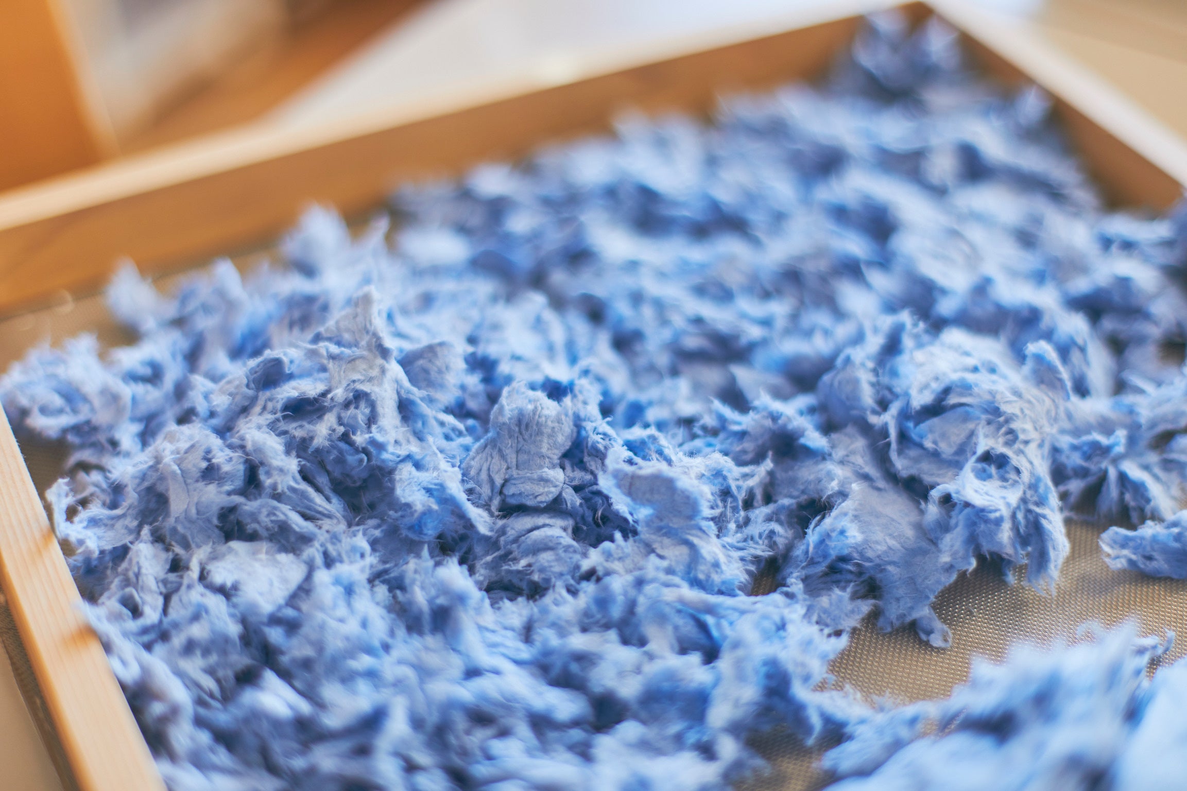 譲り受けた七夕飾りの「花飾り」は、針金でくくられていました。これらを一本一本、地道に分解してやっと TANABATA PAPER の素材にすることができます。少しだけ湿らせると、やっと紙の原料になりそうな雰囲気をまといます。