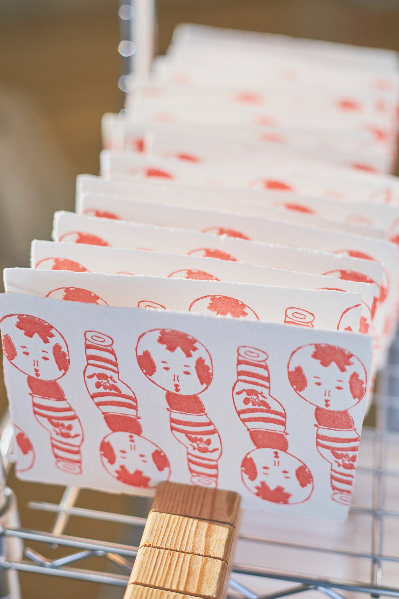 描きあげたアートワークは、その絵の持ち味を活かすように、活版印刷やシルク印刷で刷っていきます。TANABATA PAPER プロジェクトでは、写真のこけしの柄はもちろん、新たに仙台七夕モチーフのアートを描き下ろしていただきました。