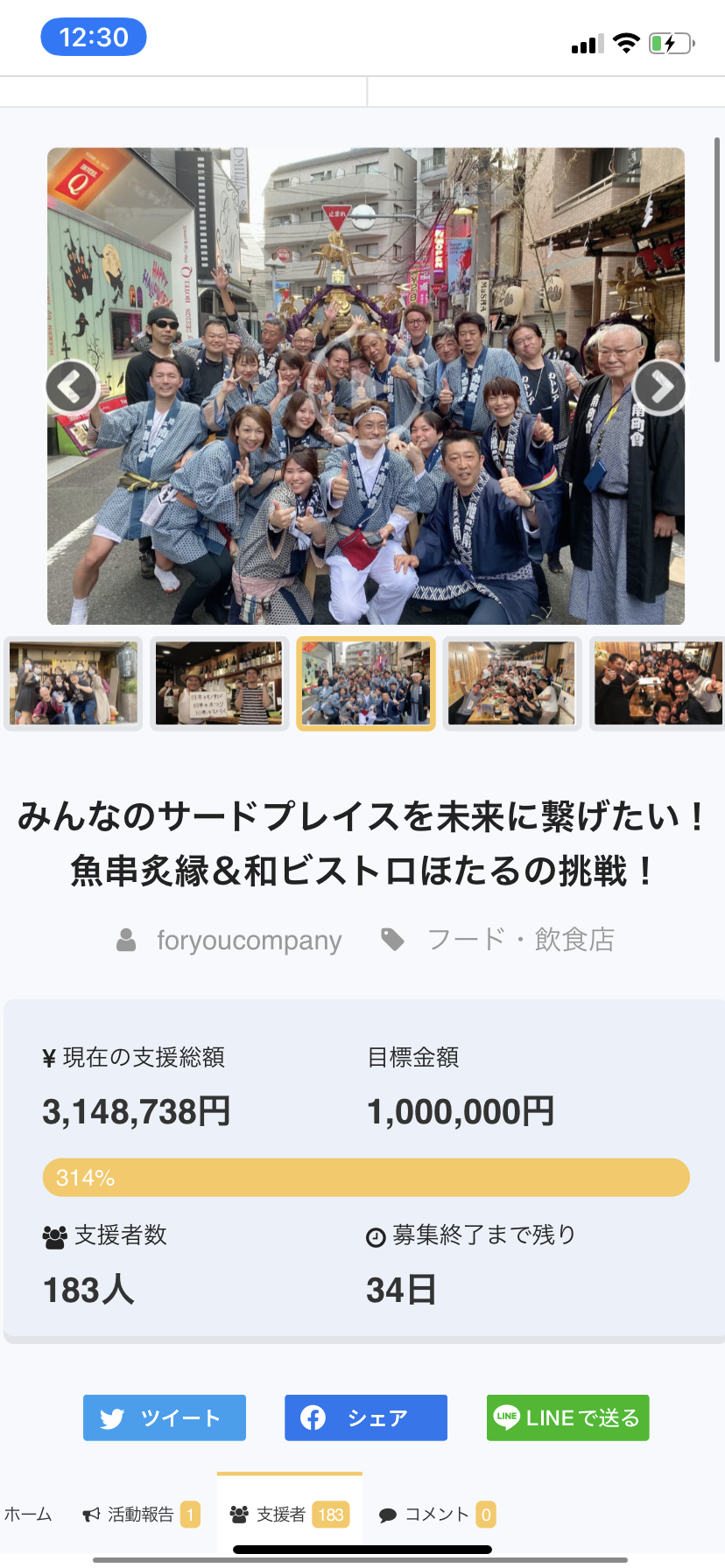 いつもありがとうございます^_^ おかげさまでクラウドファンディグ終了まで残り2日となりました!沢山のご支援、応援本当にありがとうございます!ラストスパートなんとか450万円に乗せていきたいと思います(^^)応援パワーどうかよろしくお願いします!昨日8/4に無事に本店の魚串炙縁が11周年7/27に和ビストロほたるが5周年を迎えることができました!ここまでこれたこと、みなさまの温かい支えのおかげさまです。本当に心より感謝申し上げます。今後ともメンバー一同力を合わせて、お客様や業者さまと20周年、30周年と喜びのお祝いできるよう精進してまいります!今後とも何卒よろしくお願いします。奇跡のクラウドファンディング!ラスト二日!スパートいたします(^ ^)ありがとうございます☆