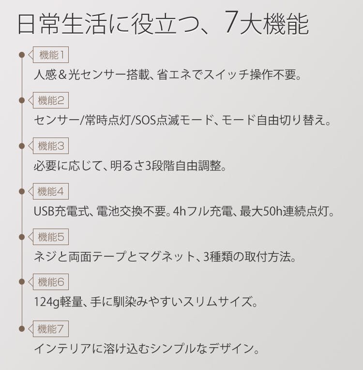 通常のセンサー&常時点灯モード以外、SOS点滅モードも装備。万が一救助が必要な場合に、SOS点滅をONにすれば、救急信号を出し、助けを求めることができます。