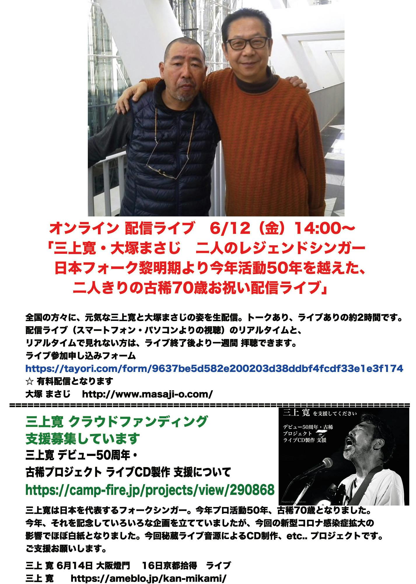 二人のレジェンドシンガー。三上寛と大塚まさじ。誕生日が二日しか違わないこの二人。、8年前に、二人で一緒にしたライブと、大塚まさじDJのラジオ、FM-COCOLO「ムーンライトマジック」に三上寛がゲストに出て以来の再会となる。今回新型コロナウイルス感染症拡大による世界の異変で、二人ともライブ活動の停止でこの先の予定がわからずじまいの現在、それでも6月より果敢に関西ツアーを敢行することに決めた、三上寛が、生ライブの他にもなにかできないかと考えたときに、盟友、大塚まさじとの再会を希望。三上寛より大塚まさじへの誘いで、生のライブではない、「オンライン配信」という形で、特別なライブが決定いたしました。