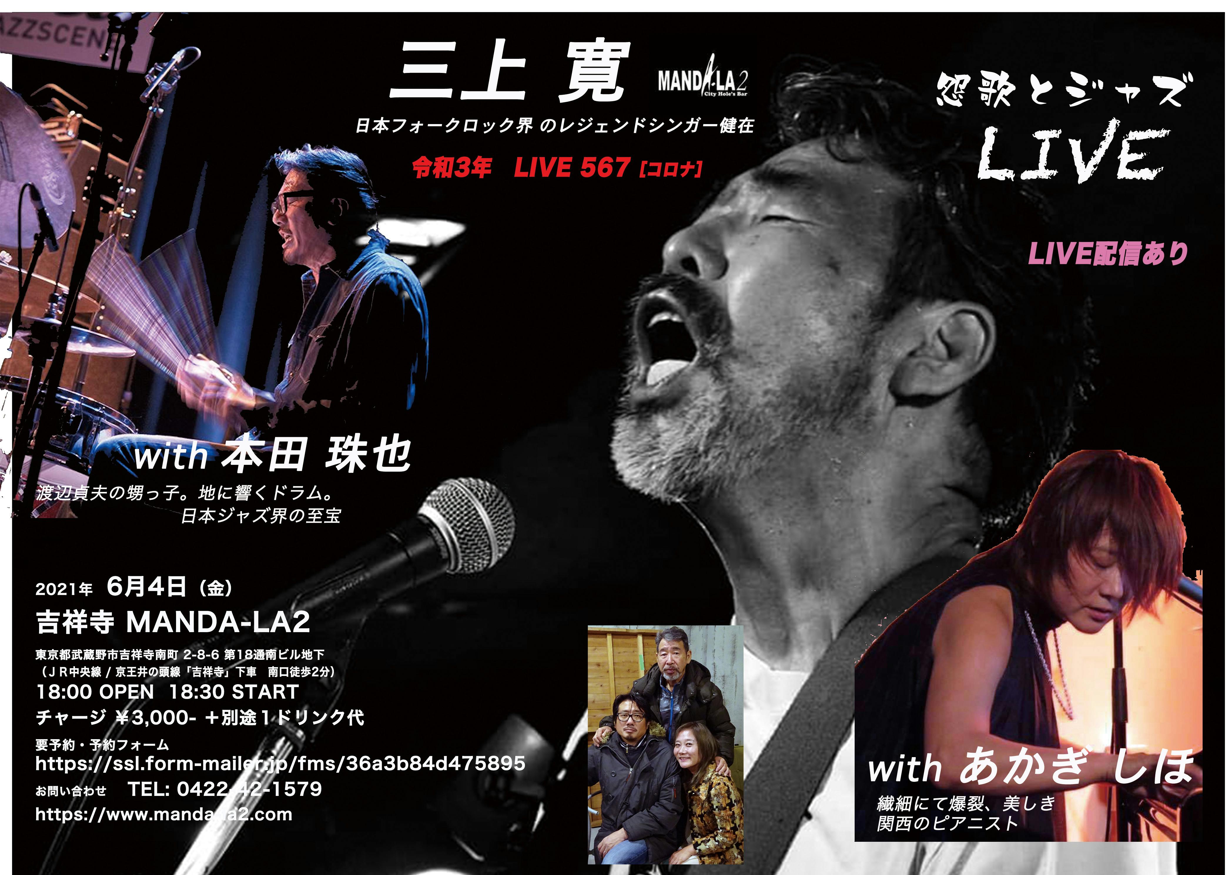 2021/06/02 16:036/4(金)18:30~三上 寛「LIVE567(コロナ)怨歌とジャズ」出 演 三上 寛(うた・ギター)本田 珠也(ドラムス) あかぎ しほ(ピアノ)みなさんお元気ですか? いよいよ明後日になった三上寛6/4のMANDA-LA2 ライブは、生ライブ配信も行います。是非ご覧ください。熱く燃えるジャズドラマー、本田珠也、美しきエキセントリックピアニストあかぎしほ とのスペシャルトリオ。東京では初めてのライブです。この時期なので、お店にくることが難しい方は是非、ライブ配信のほうをご覧ください。生ライブ終了後より一週間アーカイブでご覧いただけますので、全国のリアルで見れない方も、ゆっくりとご覧いただけます。なかなか見れないこのトリオです。是非ご覧ください。このライブはライブレコーディングの上、作品にする方向で考えています。そして、70代になった三上寛初めてのアルバムを新録いたしました。「そのさきにみえるもの」ライブ作品とともに発表します。そして今年も作品をみなさんの手に届けるために、クラウドファンディングを立ち上げる予定です。後日発表いたします。ライブ配信申し込みはこちら → https://eplus.jp/sf/detail/3426260001-P0030001三上 寛、令和3年567に唄う、日本ジャズ界を牽引するドラマー、本田珠也と関西で熱く活躍するピアニストあかぎしほとの2年ぶりの競演。三上 寛はデビュー50年以上にして過去、山下洋輔や坂田明などのジャズメンたちとのセッションもたくさん行ってきて、その系譜を継ぐドラマー本田珠也と東京で何度か行われてきた、怨歌とジャズのスーパーデュオに関西でのDUOを重ねてきたあかぎしほと共に、さらに新しい世界が展開する熱い、567を吹き飛ばすライブをご覧ください。生ライブももちろんですがライブ配信もやりますので、ぜひご覧ください!!三上寛ブログ https://ameblo.jp/kan-mikami/本田 珠也(ほんだ たまや)1969年11月25日東京生まれ。父親は、70年代一世を風靡したジャズ/フュージョン・グループ「ネイティブ・サン」のリーダー、ピアニストの本田竹広。母親は、ジャズ・ヴォーカリストのチコ本田、そして叔父が渡辺貞夫と言う日本ジャズ界のサラブレッド。小学校6年の時にドラムを始め、82年、ネイティブ・サンが斑尾ジャズ・フェステバルに出演した折に飛び入りで出演したのが初舞台。以来、渡辺貞夫、菊池雅章、大野俊三、大西順子などジャズ界のビッグ・ネームとツアーやレコーディングで共演、若くして実力、人気NO.1のドラマーとなる。97年、自己のバンドを結成。一番好きなジャズに、子供の頃より愛聴してきらロック、ファンクなどのポップ・ミュージックも取り入れたエレクトリック・バンドとして活動開始。PLANET X 、メンバーは、本田珠也(ドラムス)/五十嵐一生(ディレイ・トランペット)/津村和彦(ギター)/野力奏一(キーボード)/米木康志(ベース)いずれも、自己のリーダー・アルバムを持つミュージシャンやビッグ・ネームとの共演でお馴染みのトップ・ミュージシャンばかり。http://tamayahonda.blogspot.jpあかぎ しほ1970年生まれ。大阪出身。幼少よりクラシックピアノ専攻。大阪音楽大学音楽部器楽科卒業。第一回高槻音楽コンクール奨励賞受賞、全日本ピアノコンクール特別賞受賞。それを機にジャズの世界に飛び込み、多種多様な経験を通し独特の世界を培いながら、2枚のオリジナルアルバムを発表。ピアノ歴45年。関西を中心に様々なイベント、ライブハウス、各地ジャズストリート、ラジオ、TVなどにも出演し、現在に至る。 http://akagishiho.com6/4(金)吉祥寺 MANDA-LA2東京都武蔵野市吉祥寺南町 2-8-6 第18通南ビル地下1階18:00 OPEN / 18:30 START 1ステージのみチャージ¥3,000- + 別途1ドリンク代要予約・予約フォーム https://ssl.form-mailer.jp/fms/36a3b84d475895☆ライブ配信ありhttps://eplus.jp/sf/detail/3426260001-P0030001アーカイブにてライブ後一週間、視聴できます。問 TEL : 0422-42-1579https://www.manda-la2.com三上寛ブログ管理人 岸田 コーイチ もっと見る