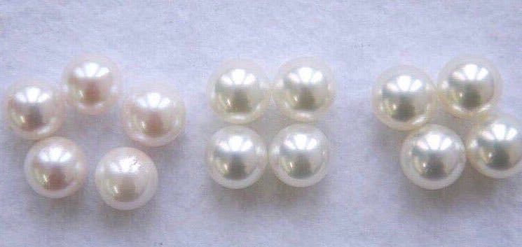 下の画像は、調色と無調色のベース色を比較したものです。左側5珠は調色、中央4珠と右側4珠は壱岐真珠の無調色です。無調色は真珠本来の明るいホワイト系ベース色をしており、写真では表現が難しいですが実際には美しい干渉色が見られます。