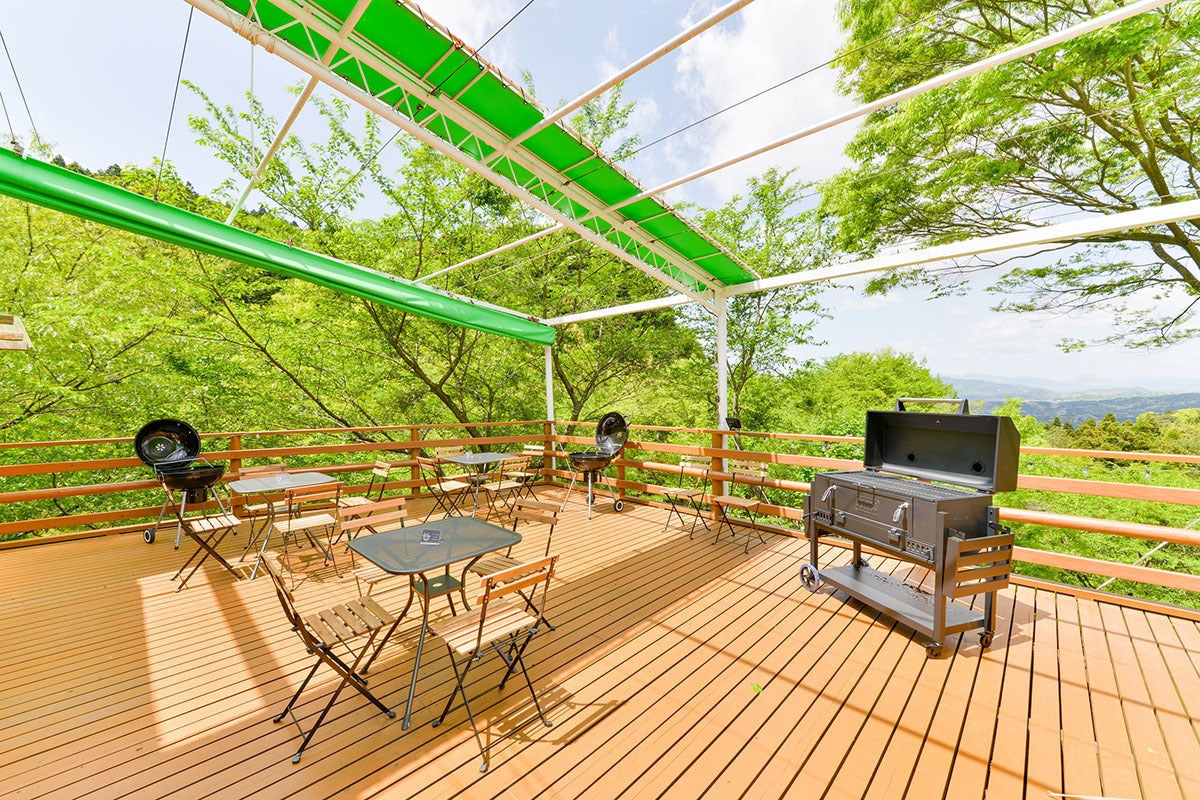 左上からBBQ・ハンモックのあるカウンター・ランチ・隣接する沢
