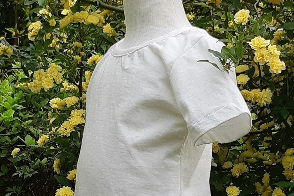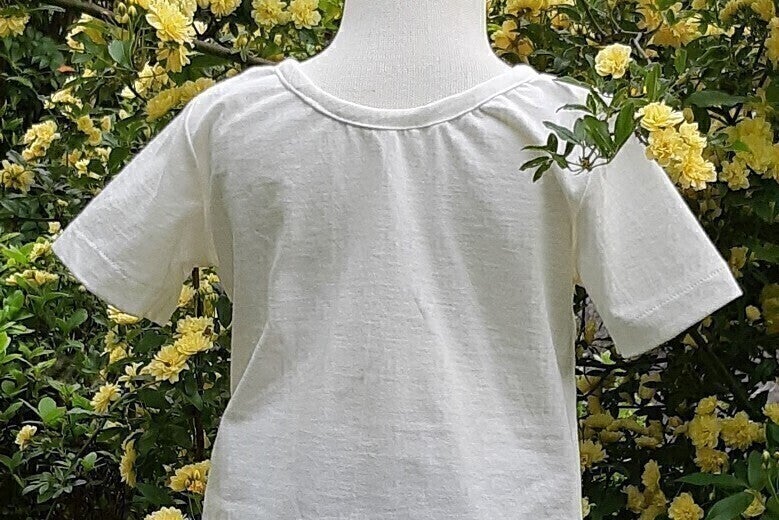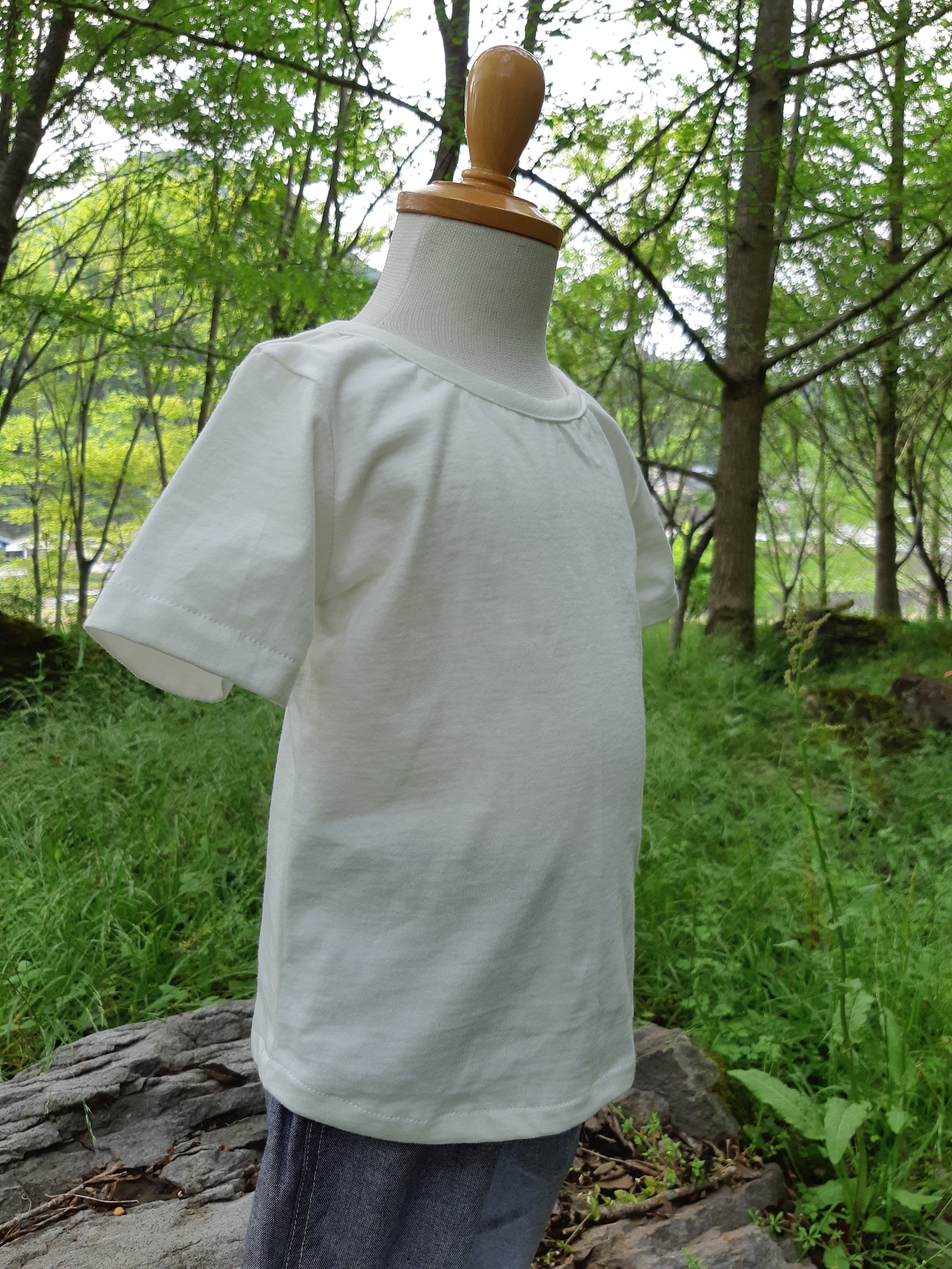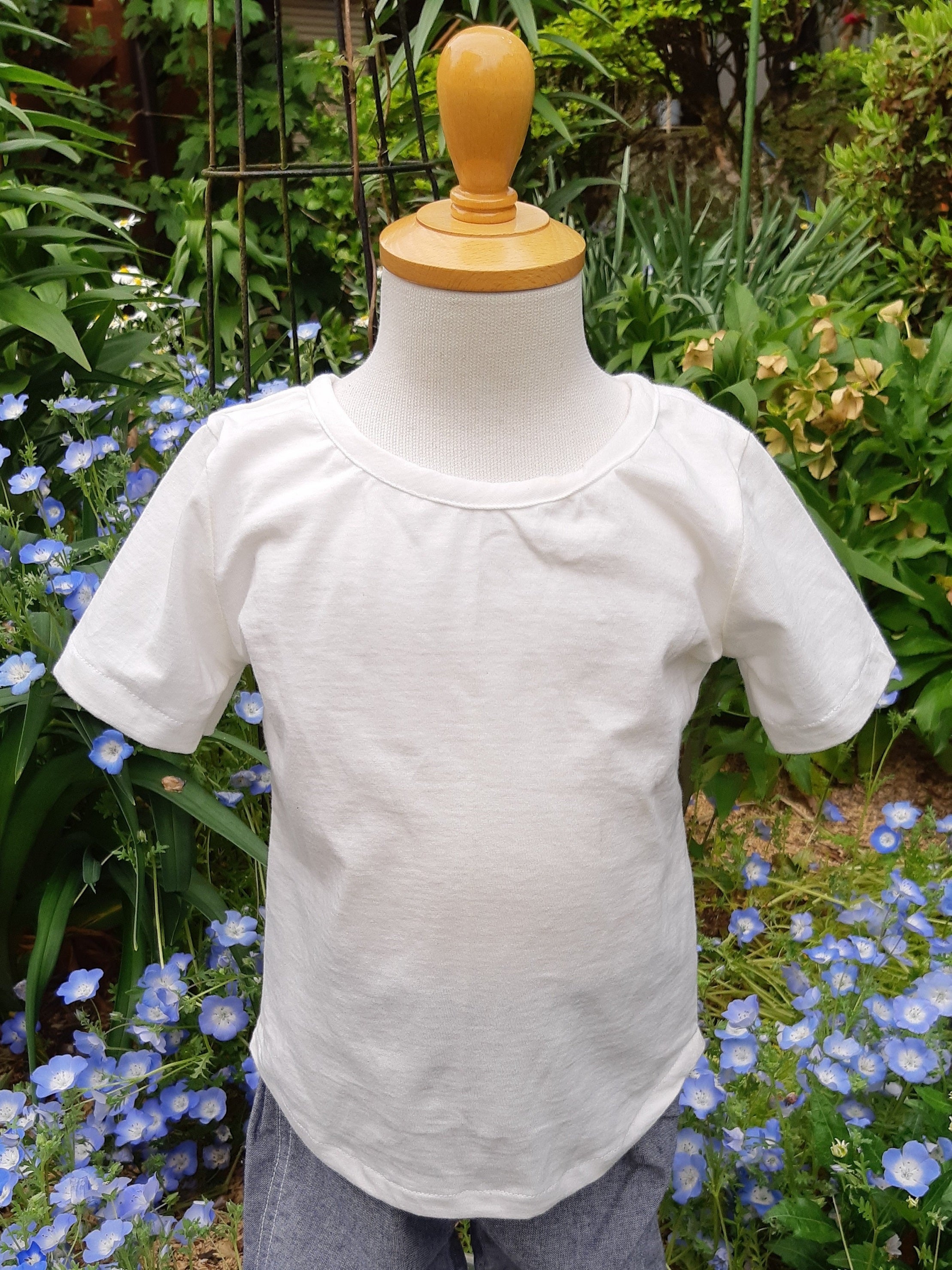 ※一番上の写真のTシャツは試作品でヨーロッパ風なイメージですが、完成品は裾がまっすぐで衿幅がもう少し太くなるアメリカンな雰囲気となります。