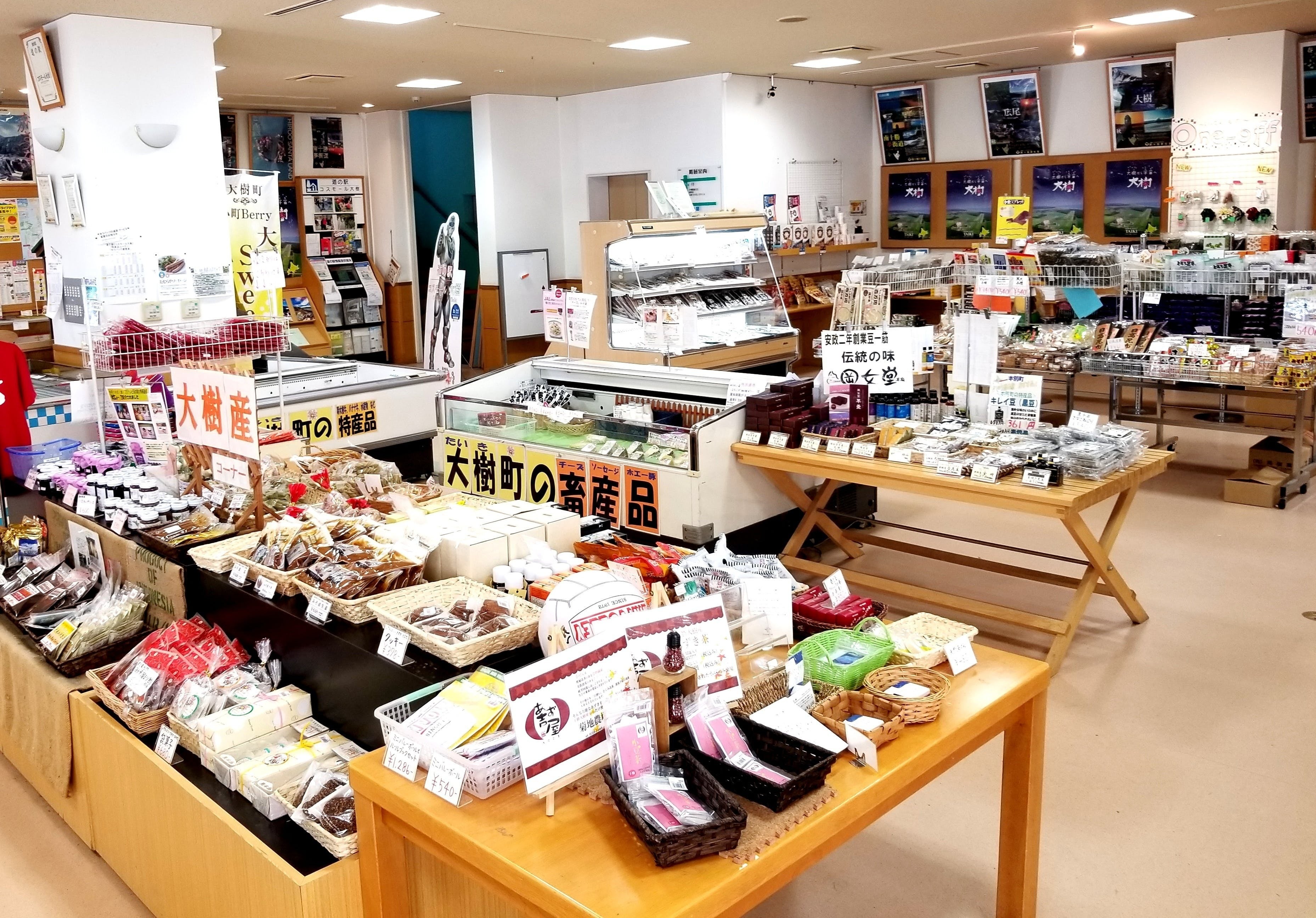 宇宙ロケットの発射場があることで有名な大樹町。道の駅にも関連グッズがたくさん並びます。ショッピングセンター併設の道の駅は、ナチュラルチーズや海と山の加工品などの特産品はもちろん、ついでに衣料や食料品も買える便利さが特徴。