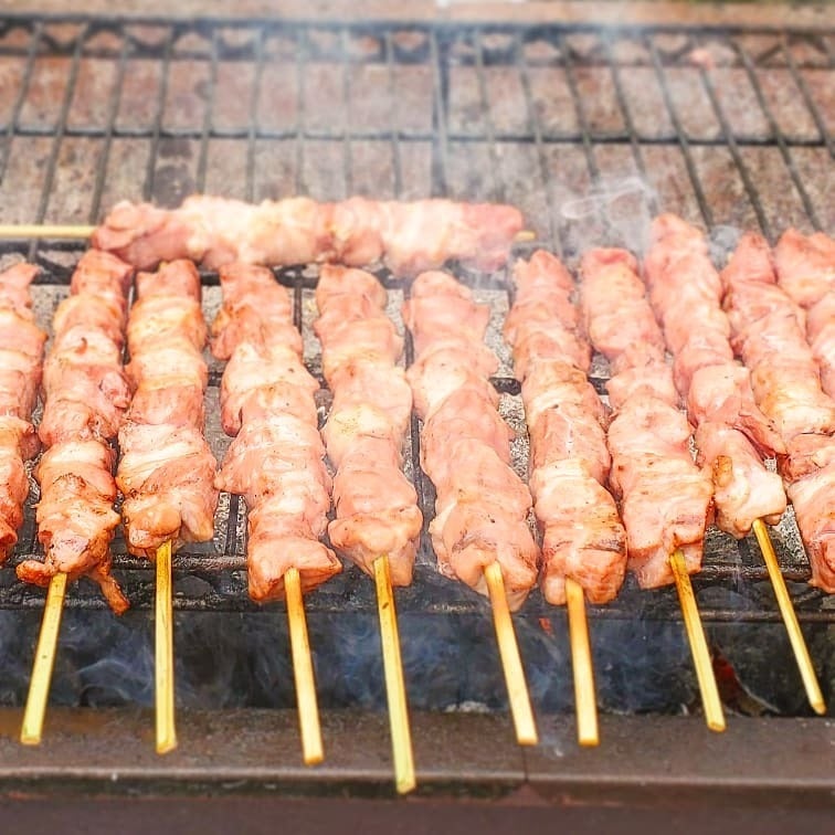 小泉重信さん「20年くらい前は、イベントで常陸牛と野菜を長い串で刺して販売していました。ところが狂牛病の騒ぎがあって、牛肉を販売できなくなってしまったのです。その頃すごく忙しくて、会社で寝泊まりをしていました。小腹が空いて、残っていたベーコンをつまみのようにペロン、と食べたら美味しくて、『そうだ、ベーコン串を売ろう!』と思いついて。その後も改良を重ねて、生の状態から炭火で焼き上げる、今のハム焼が開発されたのです。鹿島スタジアムができてハム焼の人気に火がついて、その後ロッキン(ROCK IN JAPAN FESTIVAL)ができて、ロッキンの名物になりました。」