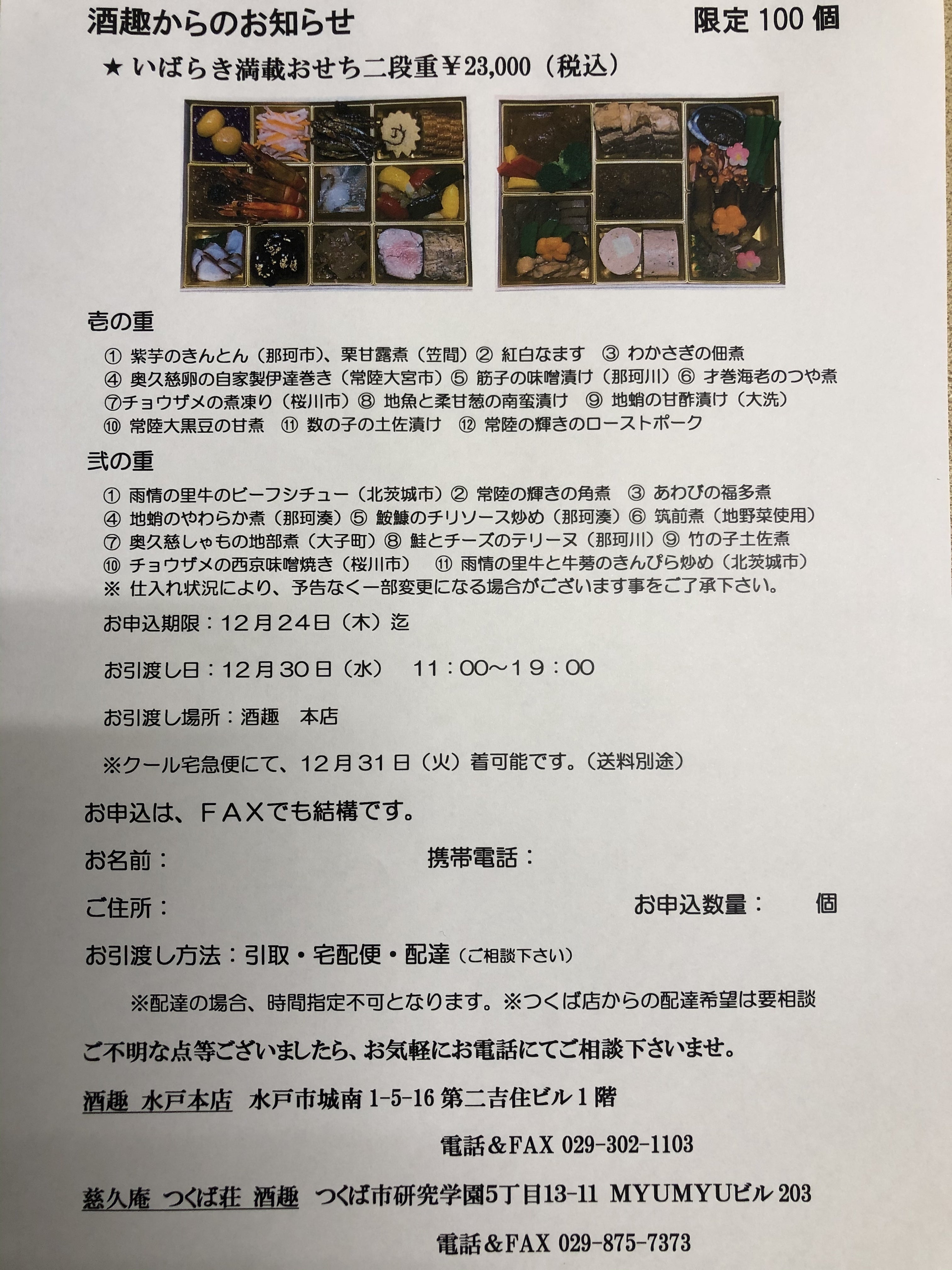 クラウドファンディング では、沢山のご支援を頂戴し、誠にありがとうございました。お陰様で何とか夏と秋を乗り越えられました。皆様より頂きました温かいご支援及びメッセージに励まされ頑張っております!私共のお店「酒趣 しゅしゅ」は、2002年よりまだ「地産地消」という言葉が使われていない時代に「いばらきの美味しいお酒や食材をPRするお店」として、「地産地"紹"」を掲げてやって参りました。その流れの中で、全国から人が集まるROCK IN JAPAN.FESで茨城の物をPRしたい!という思いから、生産量日本一のメロンが知られていないのを知って頂く為に考え出したのが「メロンまるごとクリームソーダ」でした。今思えば、世にない商品を主催者の方もよくOKして下さったなぁと思います。初出店の翌年には鹿島アントラーズさんからも声を掛けて頂き初出店から13年連続売切れ記録更新中となっております。場を与えて下さった2社と、そこに来てお買い上げ下さったFESファン、サポーターの皆様・ご支援下さった皆様に育てて頂いている商品です。心から感謝申し上げます。酒趣と言えばメロンと言われますが、お店では茨城県内中より厳選した素材(生産者を訪ね歩いて)を使った料理を提供してきました。開店以来、御節も作っております。いばらき素材を可能な限り集めて作らせて頂いたお節をご案内させて頂きます。全国発送も可能ですので、ご興味がございましたらご検討下されば幸いです。今年1年はコロナに引っ掻きまわされて終わりそうですが、来年はワクチンが出来て騒ぎが収束し、普通の生活ができる日々になる事を切に願っております。皆様にとりましても素晴らしい1年になられます事も願っております。