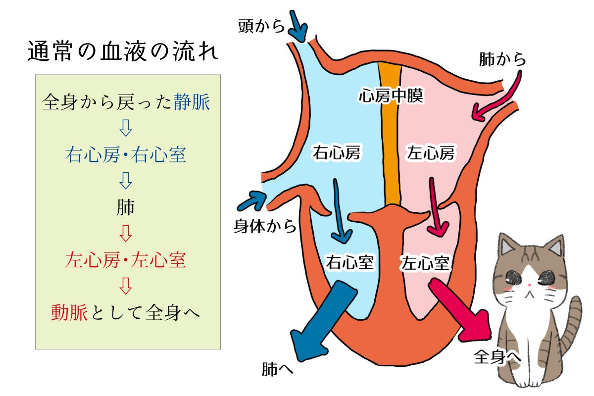 心房が分かれていない為、うまく血液循環が出来なくなっていき、心臓がそれを補うために肥大化していく病気です。