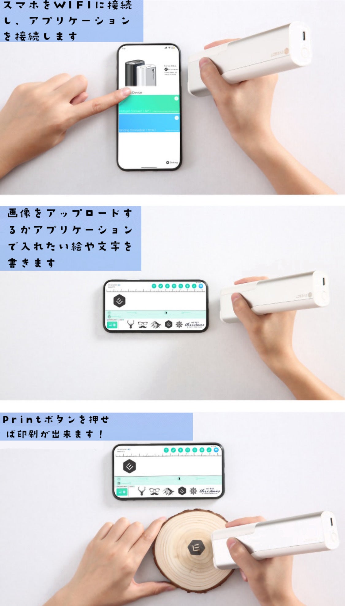 印刷しようと思ってから印刷完了までなんと3ステップで完了いたします。本品は一般消費者向けに開発されているので、お手持ちのスマホにアプリケーションを入れてしまえば、セットアップは完了します!