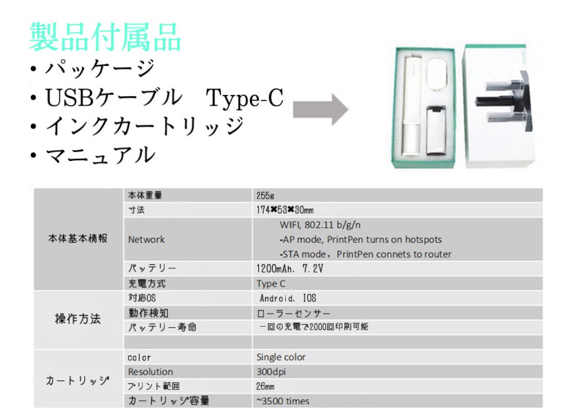 本品の重視すべき点は何といってもその形状にあります。よくある従来品はキューブ型の四角い形状を採用していましたが、これはペン型です。ペン型にすることによって、印刷時のブレやゆがみを軽減できるようになりました。人間ペンで文字を書くように、同じ動作でプリントを行えます。