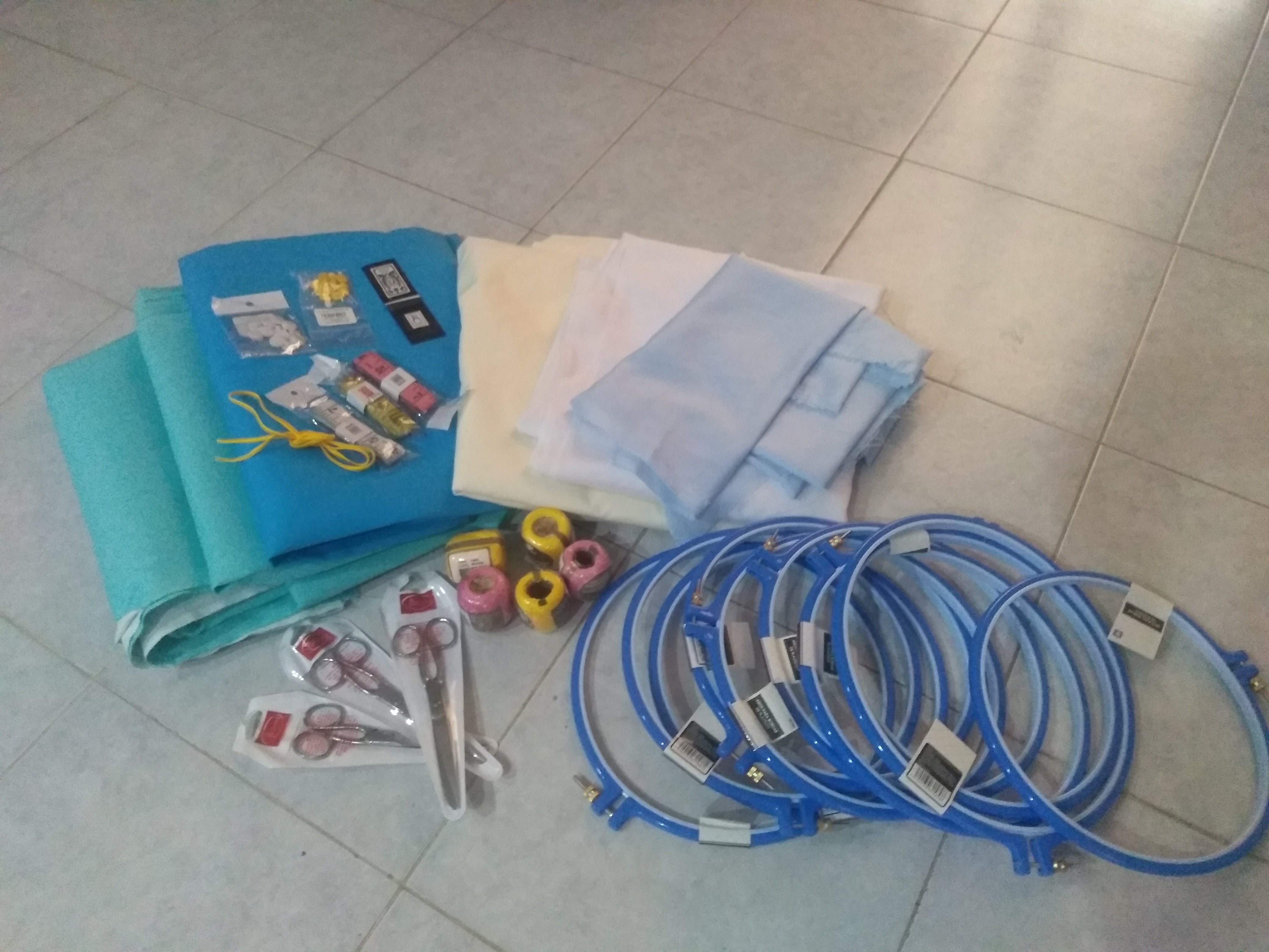 今回購入したのは写真の通り、刺繍枠x10、レッスン用の布x10m、はさみx3、糸x5、メジャーx3、針、ボタンx2などを購入させていただきました。またそろそろ商品開発も考えていかなければいけないので、ターコイズブルーの布x8mも購入しました。皆様のご支援があってこそ、ご購入できております。改めてお礼申し上げます、ありがとうございます。