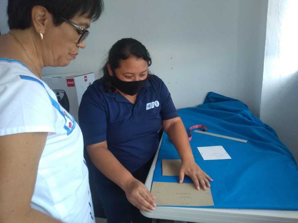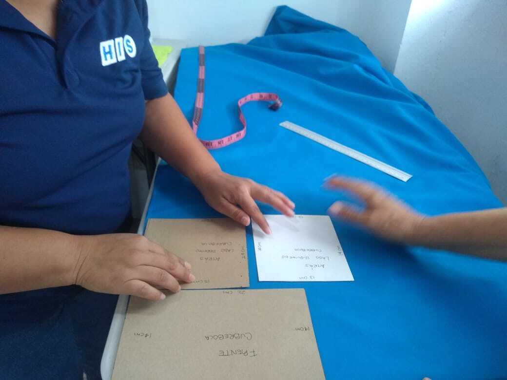 先に私達の方で型を起こし、布を余すところなく作るにはどのように配置していけばいいかなど、NPO代表のラウラさんにもお手伝いいただきました。皆様からのご支援で購入した生地、1mm も無駄にしないように取り組んでいいます。