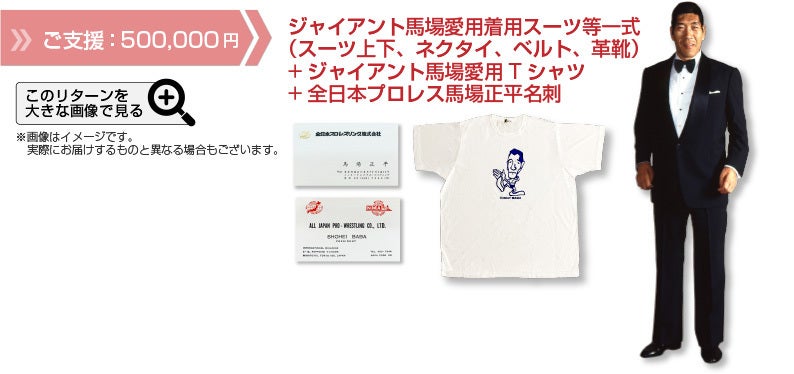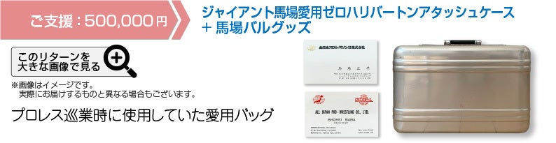 馬場さんと触れ合える場所を存続させるために、皆様のご理解ご協力を賜りたく存じます。目標金額は馬場に因んで880万円とさせていただきました。ご支援へのリターンとして、生前ジャイアント馬場さんが愛用していた秘蔵コレクションも用意させていただきました。どうぞよろしくお願いいたします。
