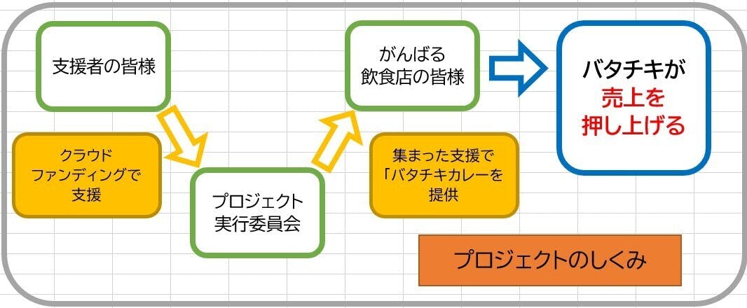 そう思った私はこの「バタチキ」をみなさんに提供する事で貢献できないか?カレーを提供する事で 、元気と笑顔がぐるぐる回ってくれると、このプロジェクトを始めました。