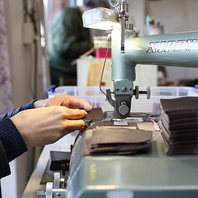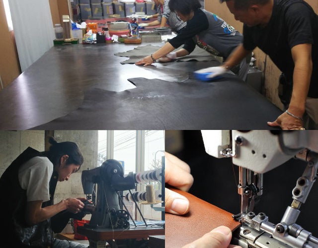 タンナーによるオイル塗りや熟練職人による裁断、縫製、コバ(断面)処理など