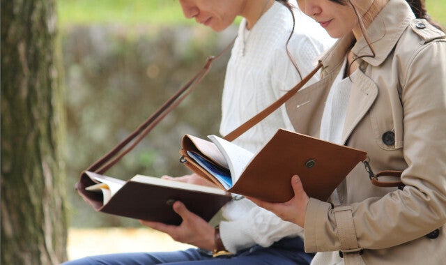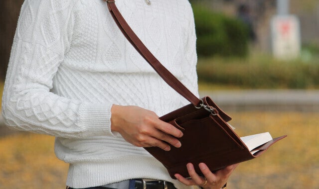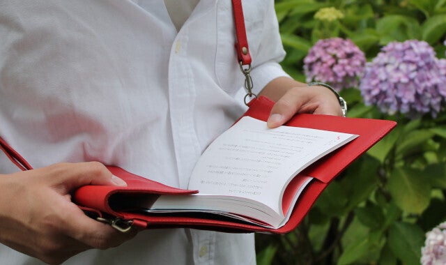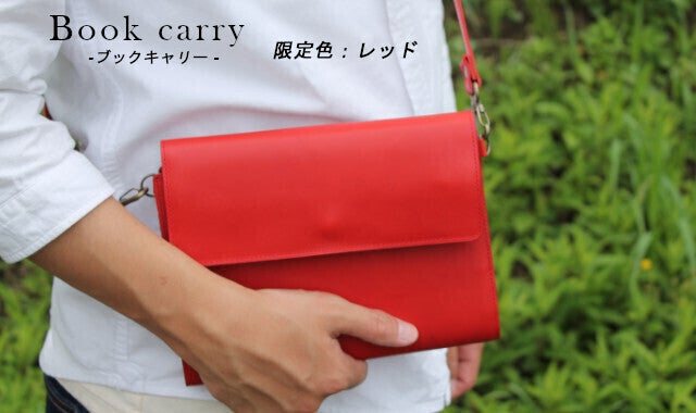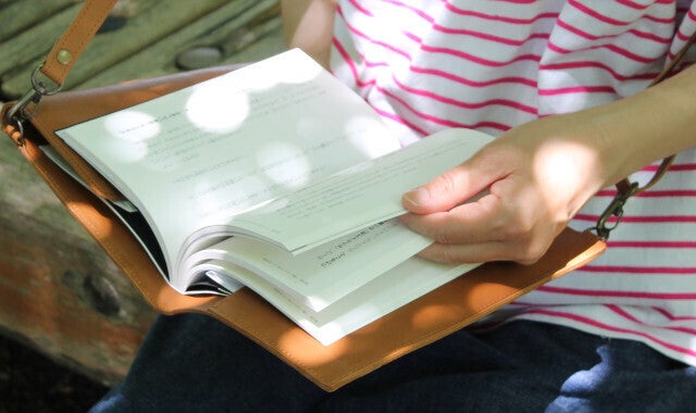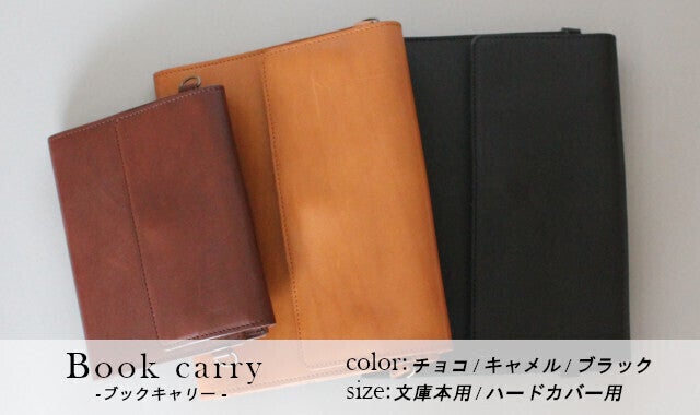 ブックキャリーは、一般的なブックカバーと同じ仕様でありながら、肩から掛けられるショルダーが付いているので、本が傷ついたり汚れたりする心配なく持ち運びができる本専用のバッグです。