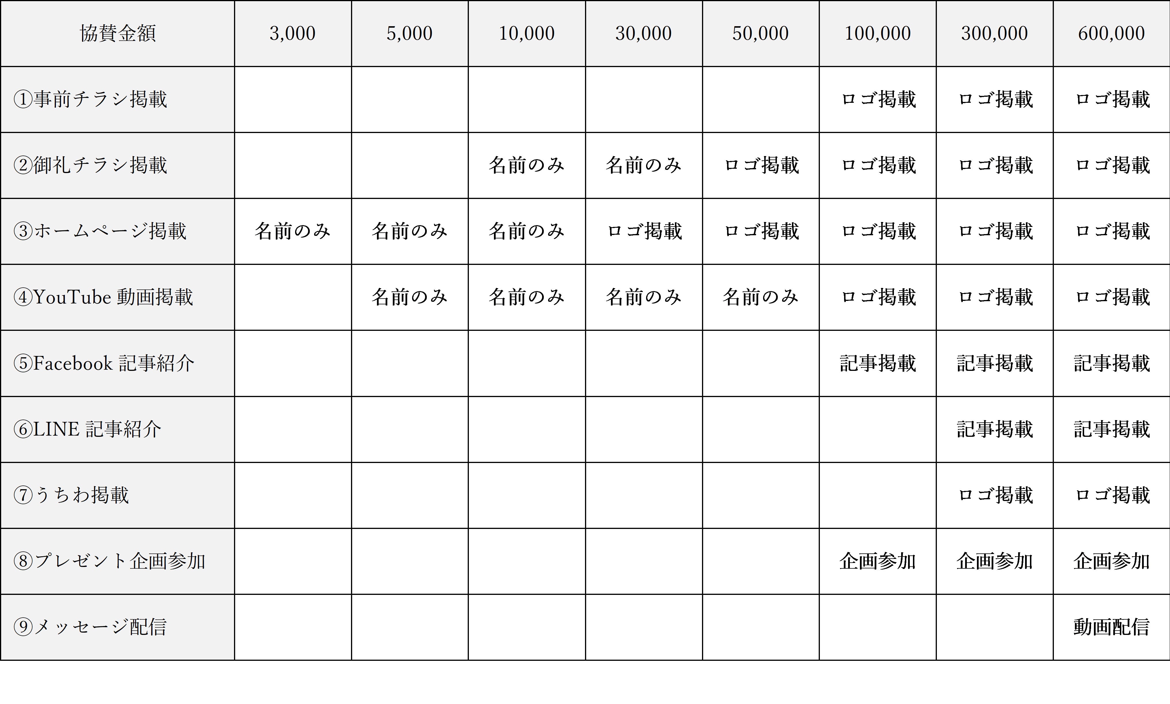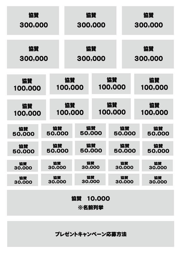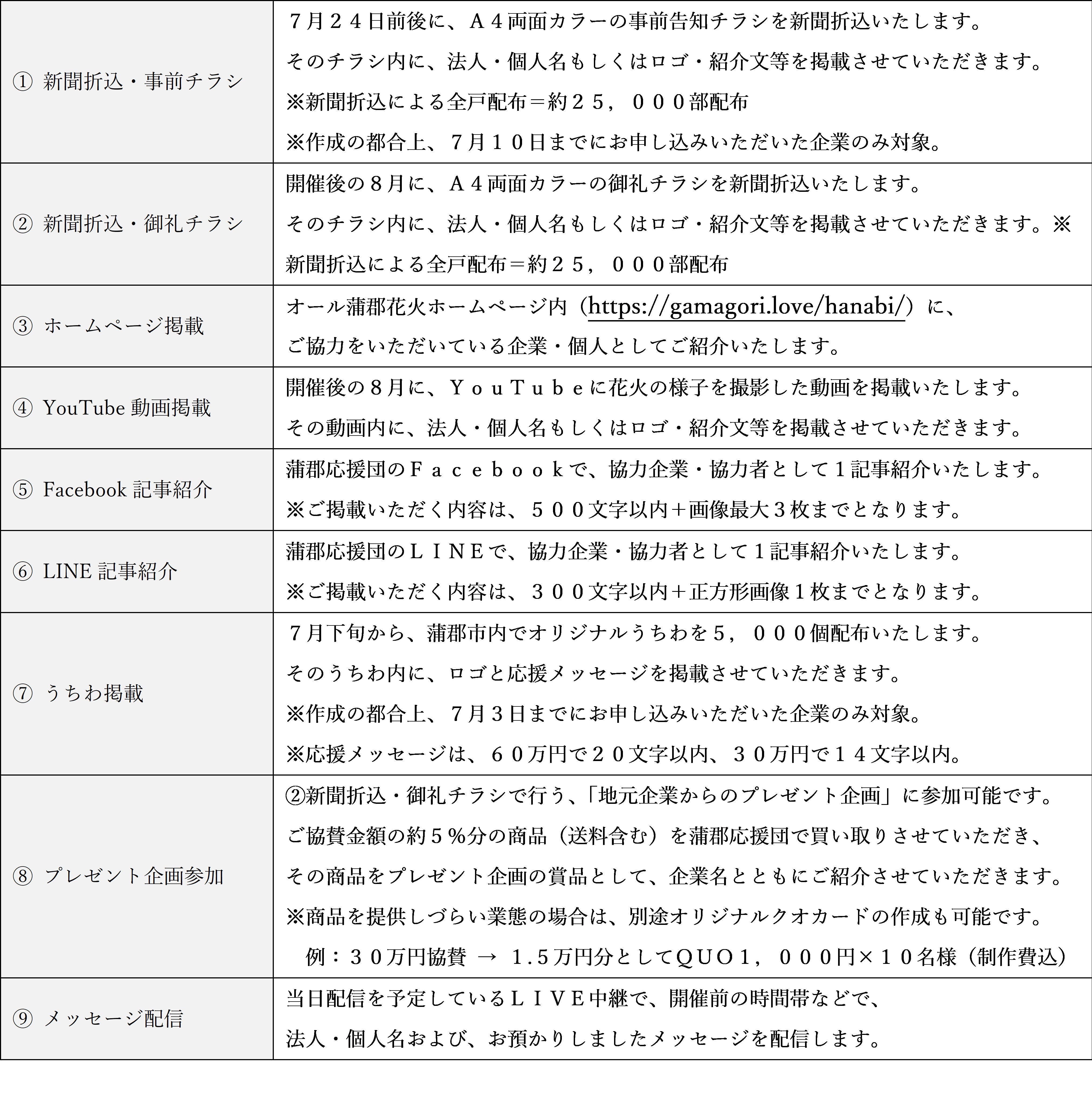 ※事前チラシ / うちわ は配布時期・準備の都合上、事前チラシ(7月10日)うちわ(7月4日)が掲載可能締切となります。上記期日を過ぎてしまった場合、対象金額をご協賛いただいても掲載できませんのでご了承ください。なお、それ以外の協賛特典に関しましては通常通り実施致します。