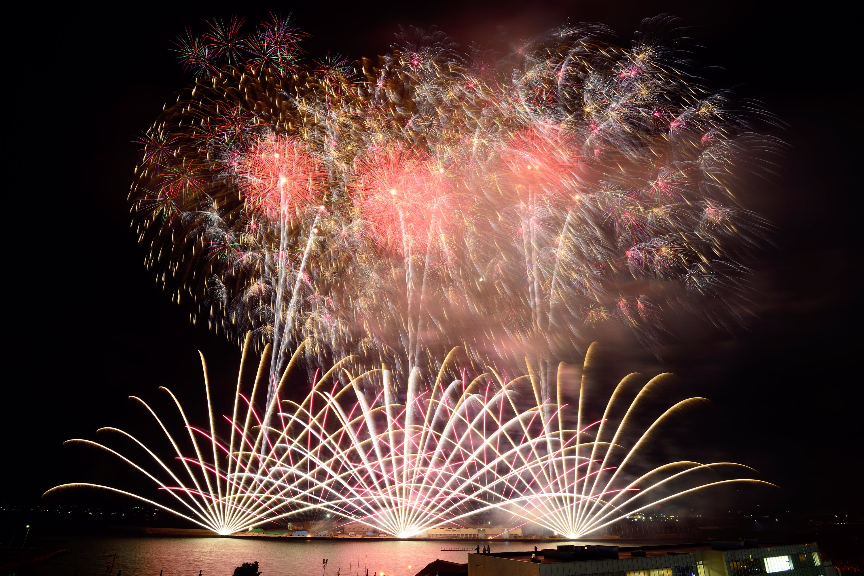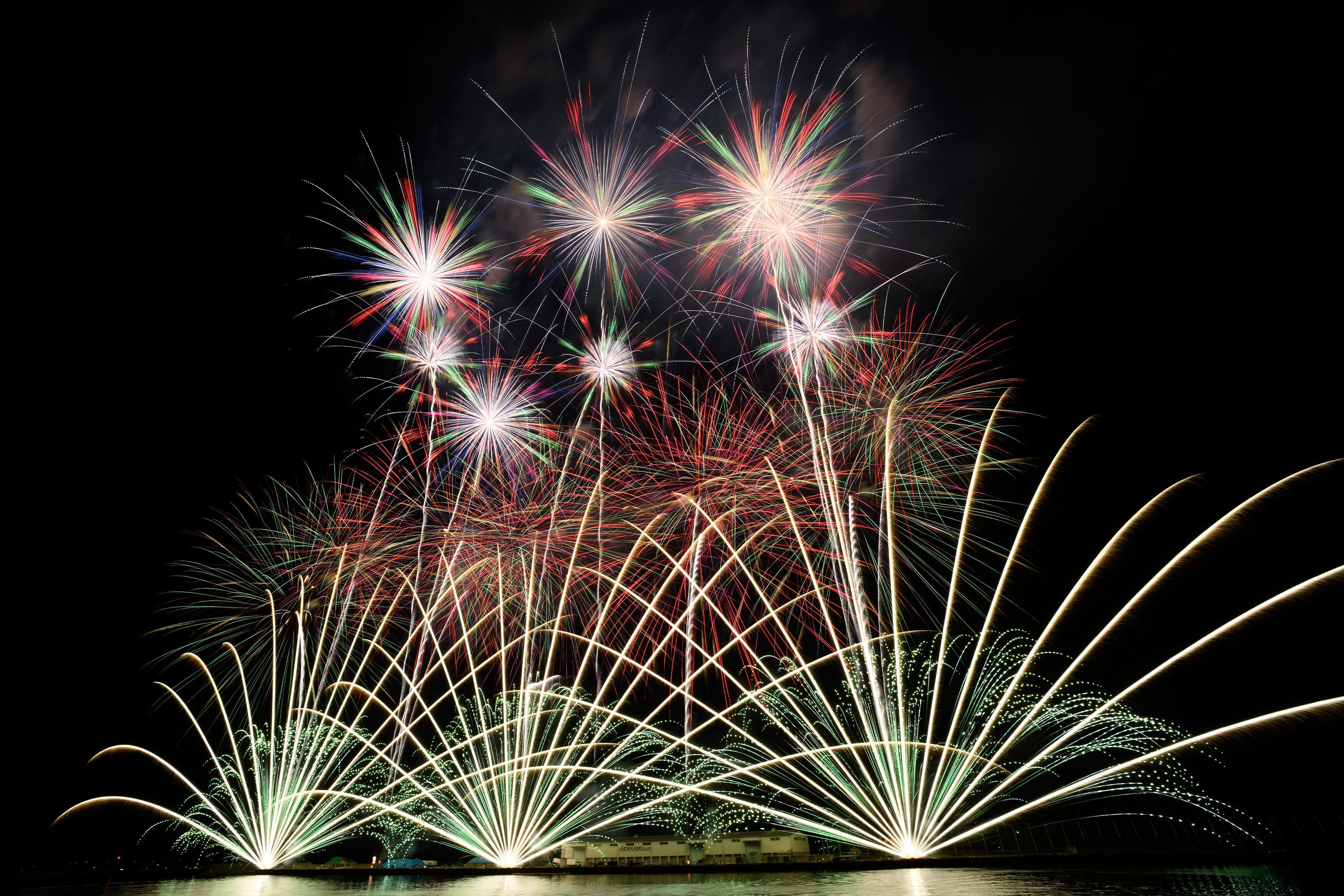 皆様にご案内をする中で、当日の花火イメージをしっかりとお伝えできていないことに気が付きました。蒲郡市内にいれば、だいたいどこにいても、2~5カ所から花火が打ち上がるのが見えるとお考え下さい。「あっちも花火!こっちも花火!」という今までにない10分間です。私の頭の中ではすごいことになっています。冒頭でも掲載した以下の写真が、最も近いイメージです。ぜひぜひ、お楽しみに!