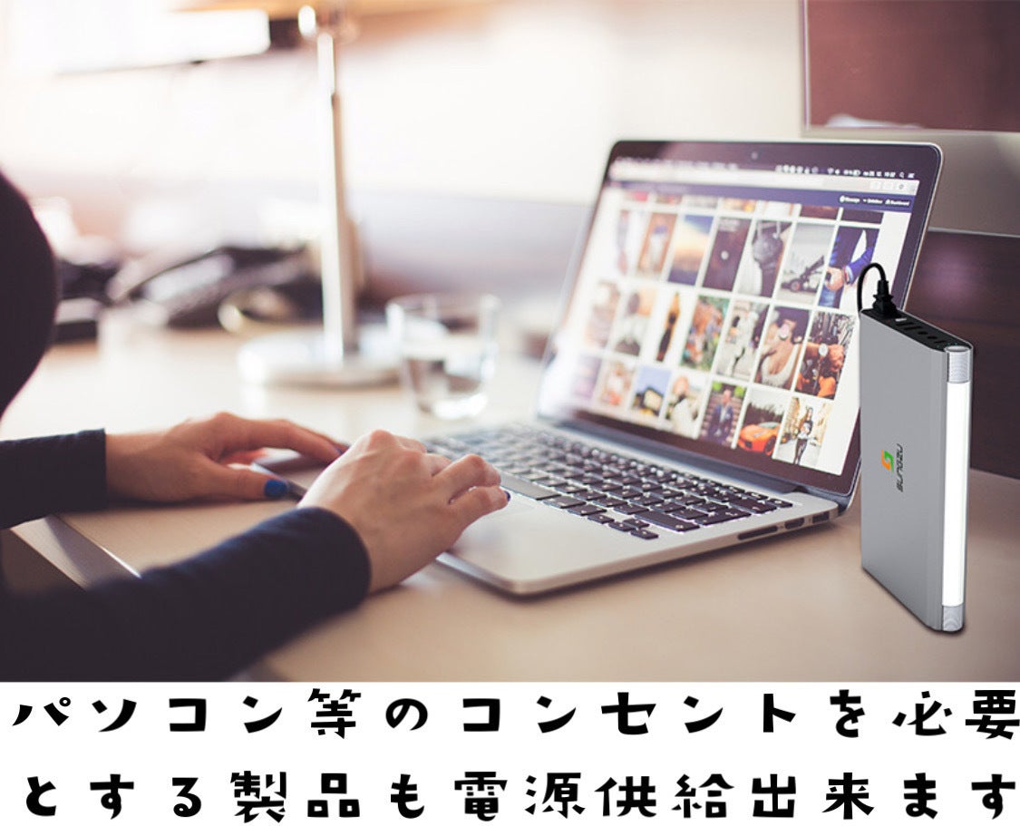 様々な家電製品を外出先でも使用したい!そんな声をもとに作られたこのモバイルバッテリーはコンセントをさせるようになっていて、様々な家電製品を持ち歩くことを可能にしています。パソコンや携帯はもちろん、アウトドアで使うランタンや、扇風機、ヒーターその使用用途の可能性は無限大です。