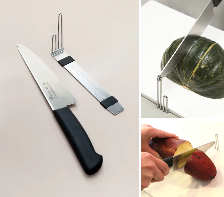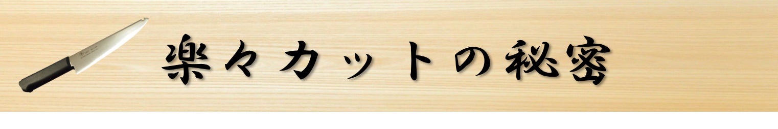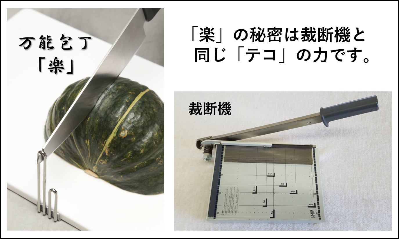 「楽」は硬い食材をテコの力で楽々切ることができる、革新的な万能包丁です。