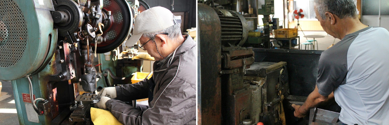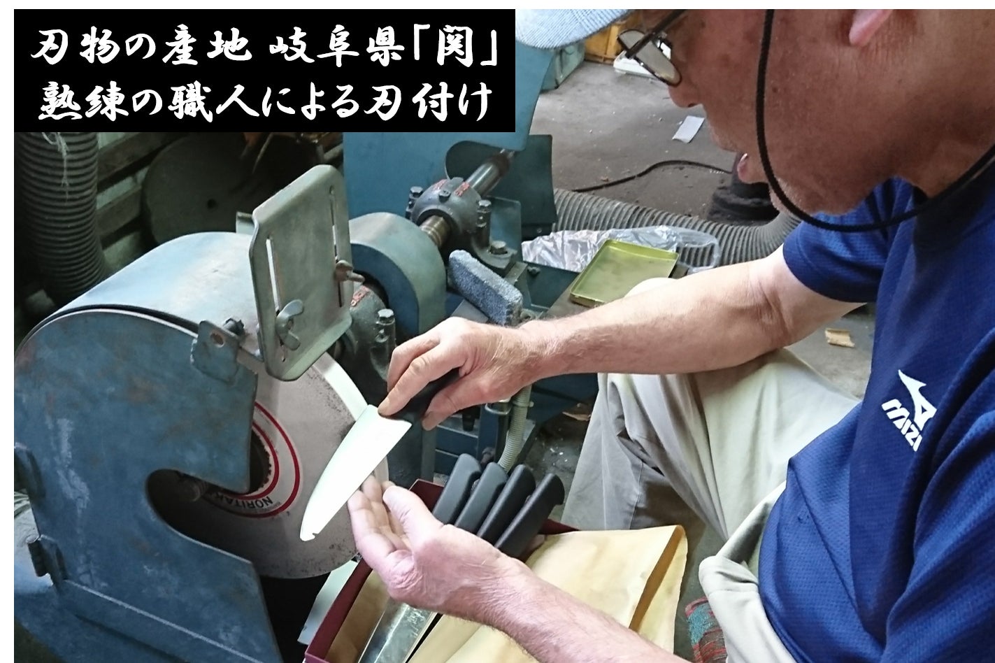刃物の産地「関」での刃物製造の写真。「プレス」および「研磨」工程。
