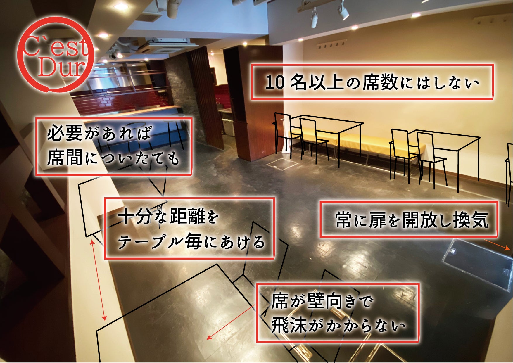 十分な距離を空け、対面しないように配置されたテーブルで、お料理を提供する予定です。