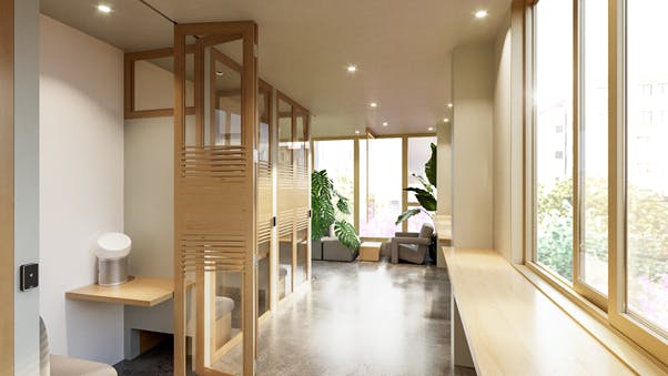 また、オープンスペースだと仕事がやりずらいと感じている創業時のベンチャー企業様のサポートにもなればとも考え、減価償却可能なリースモデルで、敷金・礼金もなく、初期費用が抑えられる仕組みを考えました。社員さんが全員利用可能な、サブスクリプションのモデルでの契約が可能で、登記サービスも提供する予定です。
