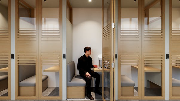 オフィスはプライバシーが保たれている個室型ブースにて構成されており、デスクには電源とWifi環境が準備され、パソコンを持ち込めば、静かなラウンジのような環境でリモートワークを行うことが可能。