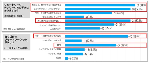 リモートワークにおける最も大きい不満は、「集中できない環境」「気持ちの切り替え」「コスト」にあることが分かり、今までとは違ったリモートワーク環境へのニーズの高さを実感しています。