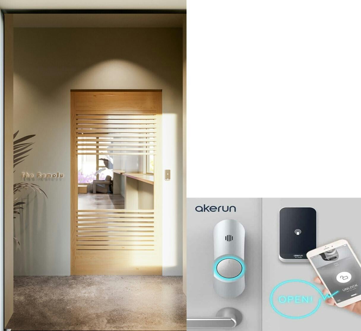 エントランスではスマホ認証によるセキュリティーが保たれた状態でリモートワークを行うことが可能。監視カメラも含め、外部監視が24時間稼働しており、現在の混み具合などはWEBサイトを見て来店前から知ることができるシステムも導入し、そのままスマホで決済も可能。