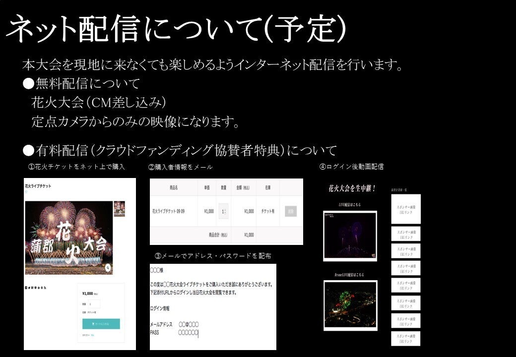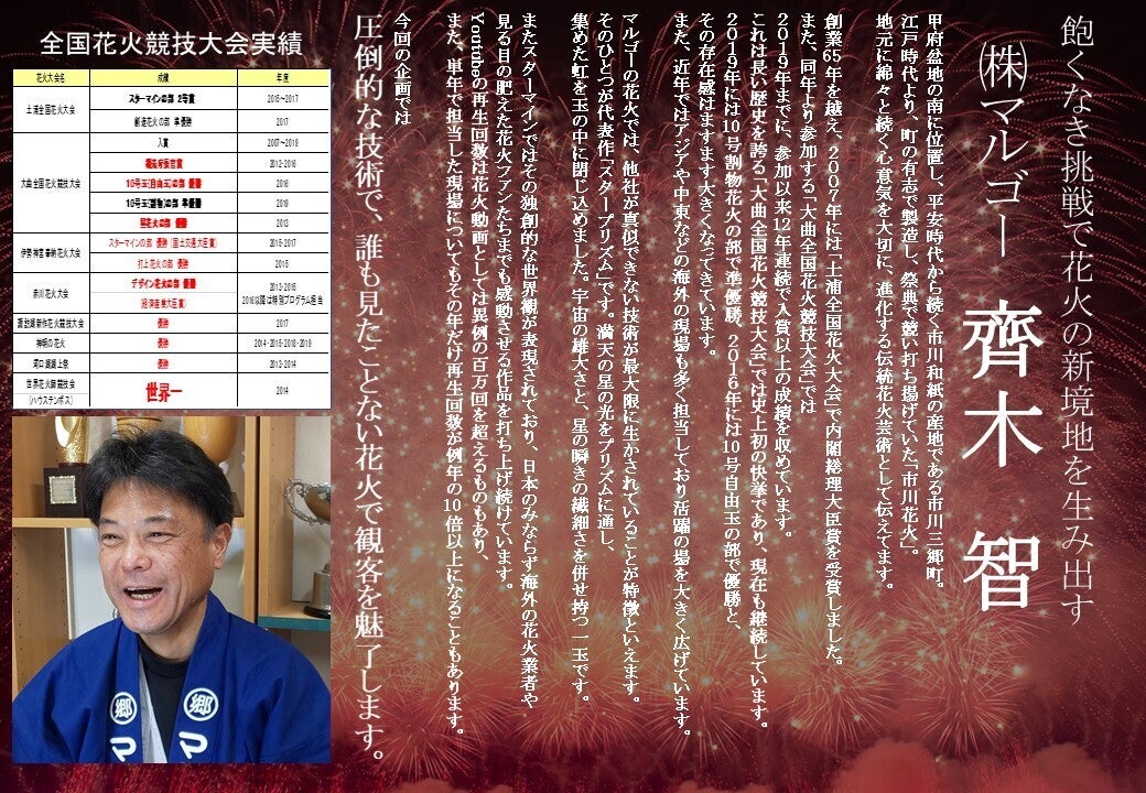 もしご支援いただければ、「日本の花火」という文化の維持、発展のために花火を打ち上げることができます。各地の花火業者の協力を得て、特徴の異なる花火を集めることができます。資金が十分に集まれば、より多くの花火業者の花火を使うことができるようになり、本花火大会の魅力が大きくなりますし、広く花火業界の助けとすることができます。