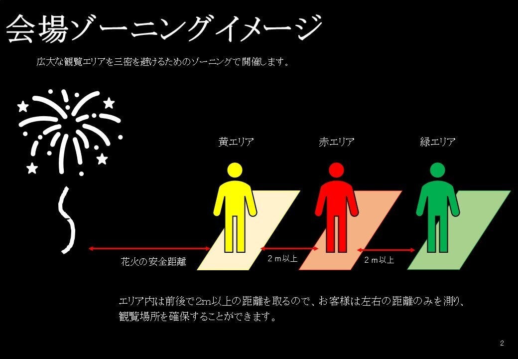 また、花火大会に来場する人を限られた人数とすることで、3密を避けるよう工夫した指定席のみで行うことができ、3密を避けた会場設営ができます。