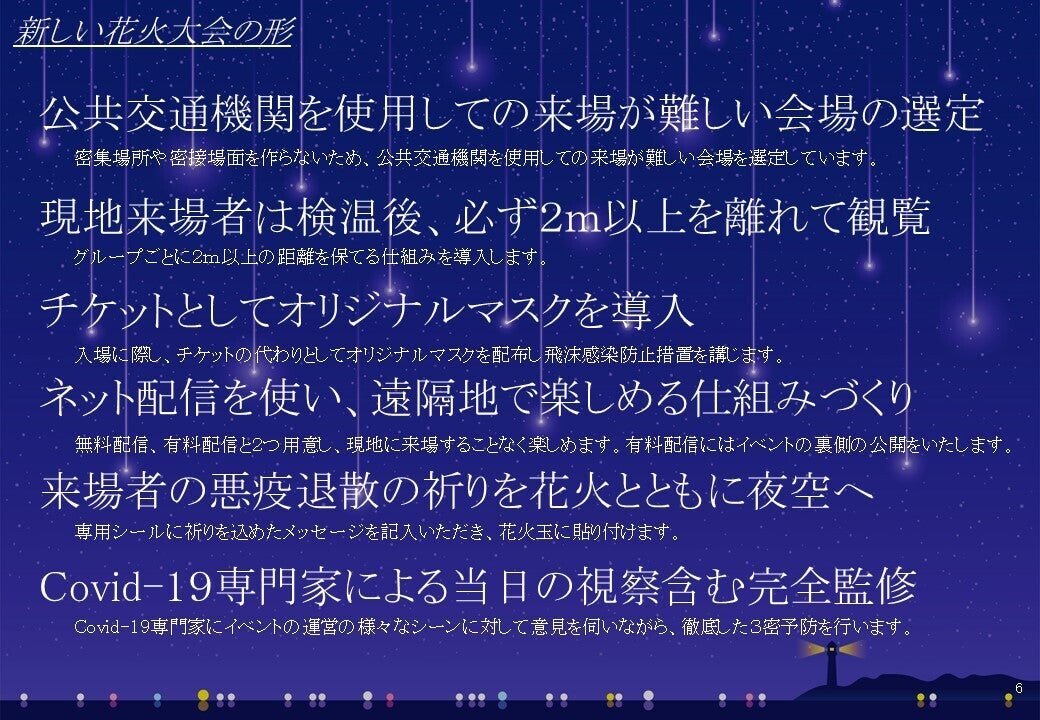 ではそんな素晴らしい力を持つ花火を数多く打ち上げる花火大会はなぜ中止になってきているのか。それは新型コロナウイルス感染拡大防止のため、不要不急の外出は禁止。密閉空間、密集場所、密接場面の3密を避けなければならない。そのような現状では、通常の花火大会はまさに避けるべきものと言えます。3密を避けつつ、花火を打ち上げるためには、新しい花火大会の形が必要になります。