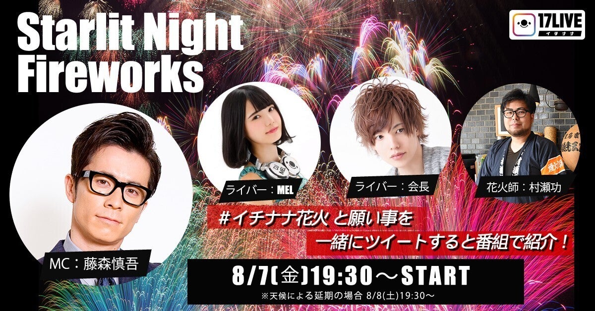 2020/08/05 09:00Starlit Night Fireworks in 関西は新型コロナウイルス感染拡大防止の観点から延期とさせていただきましたが・・・この度、17LIVEより花火を17LIVEバージョンに変更をし生配信いたします。MCにオリエンタルラジオの「藤森慎吾さん」ゲストに人気17ライバー「MELさん」「会長さん」をお招きしての配信となります。8月7日19:30~は是非17LIVEで花火をお楽しみください!!下記より視聴できます!↓↓↓↓↓↓↓↓↓↓↓↓↓↓↓↓↓↓↓↓↓↓↓↓↓↓↓↓↓↓↓↓https://17appv2.onelink.me/D7OH?pid=InappShare&af_c_id=profilepage&af_dp=media17://v2/streamer_profile/bb574417-ffe3-47ee-8a19-1a0e84d0a7a7&af_web_dp=https://17.live/profile/u/bb574417-ffe3-47ee-8a19-1a0e84d0a7a7?lang=jaもしくは17LIVEで「StarlitNight_花火」と検索してください! もっと見る
