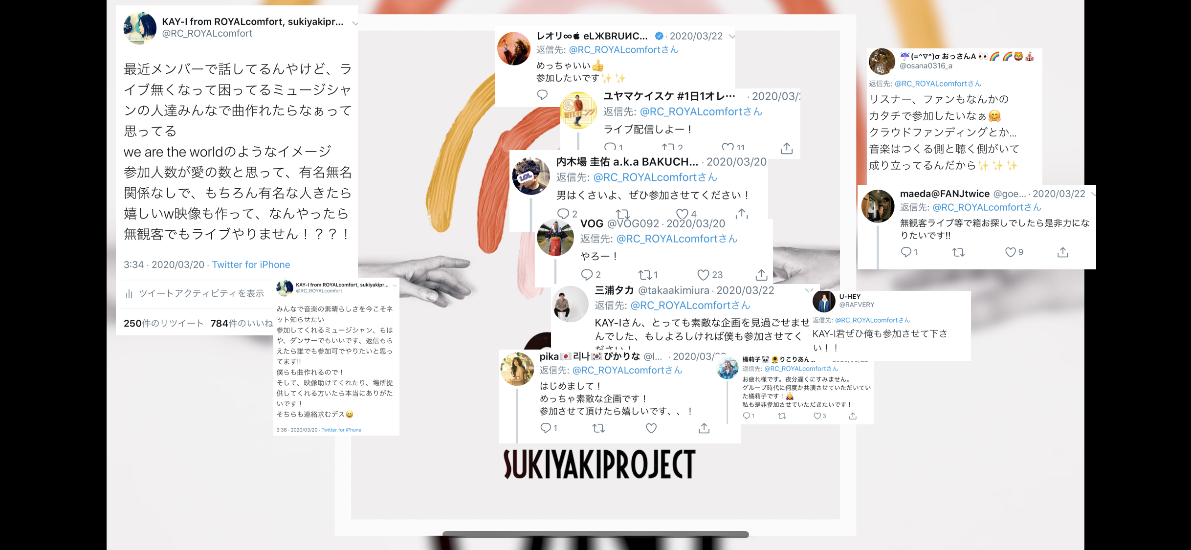 このSUKIYAKI PROJECTは、コロナの影響でライブやイベントが無くなり始めた3月の時点で僕らと同じように困っているミュージシャンと手を繋いで何かできないか?とSNSで呟いてから、それに反応をくれた方々と作ったチームなのです!