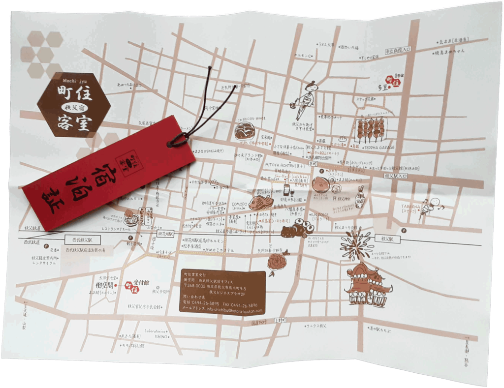 「町住客室 秩父宿」は1泊素泊まり「ちちぶ付き」という販売形態を取っています。「ちちぶ付き」とうのは、受付でお渡しする地図を片手に、宿泊する皆様には、町なかを歩いていただき、無料でたい焼きやいなり寿司、今話題のイチローズモルトなどを召し上がっていただける特典を意味します。この特典は当社の支配人が一軒ずつ回って協力してもらえるお店へ交渉してきました。