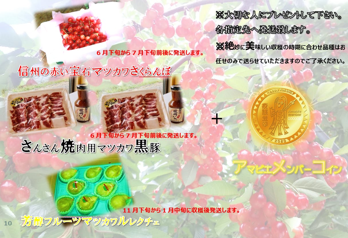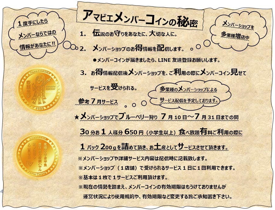 前段で述べました通り、私達の松川町は本来、この時期たくさんのくだもの🍒🍎🍐🍇🍑を観光などでお越しいただきました皆様に、楽しんでいただいておりますが、このコロナ禍でたくさんの実りがいつものように食べて頂けない状況の為、このように予約販売型で購入して頂きたく思いました。そして支援者の方々に、また来ていただけるように願いを込めてアマビエメンバーコインをセットさせて頂き、未来のサービスで繋がりたく思いました。