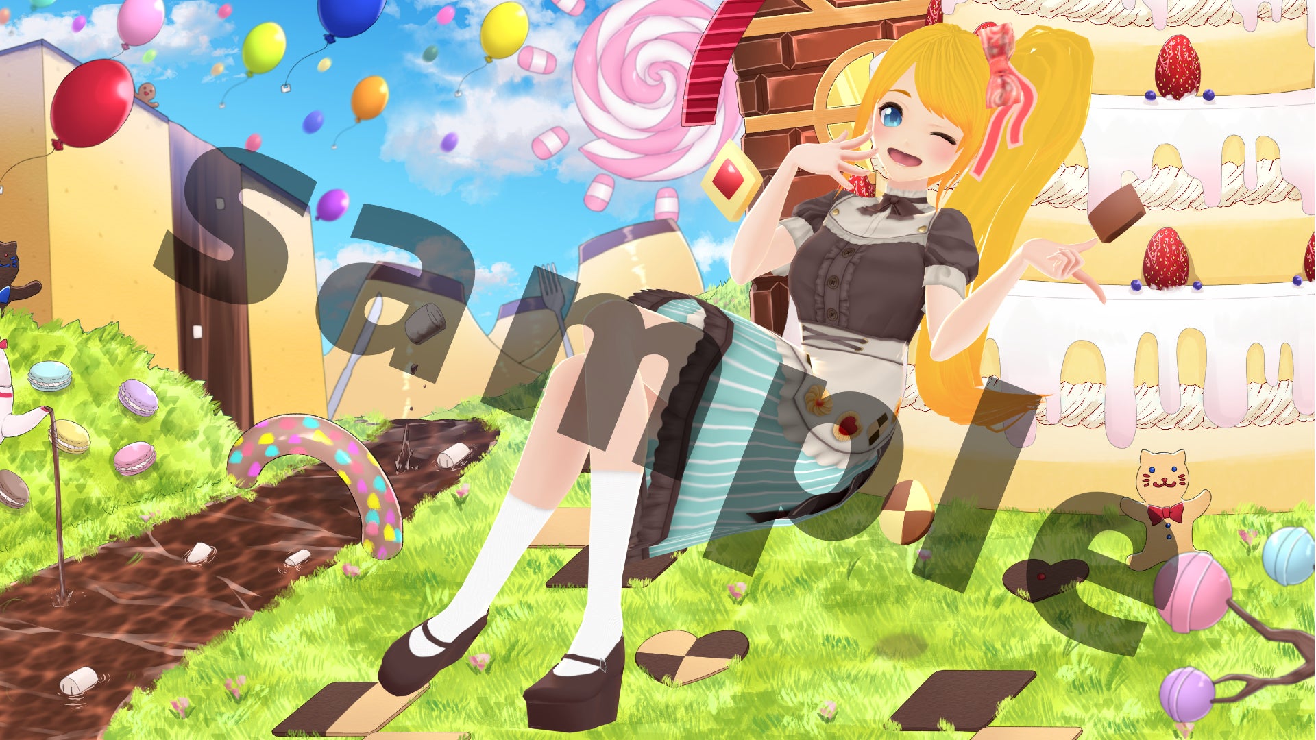 お菓子の国をイメージして、チョコレートの川やマシュマロが泳いでいたり、お菓子のお家があったりなど、モデルに合わせた盛り沢山なイラストです