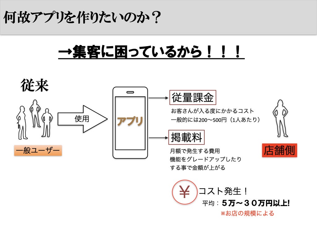 それは、ずばり「開発金額が高額だから」です。詳しい方はご存知かもしれませんが、アプリの開発にはかなりの金額がかかります。(ピンキリですが)そして結論から申し上げますと【プラットフォームの開発】と【皆が使いやすいく便利なクオリティにする】事で莫大な製作費がかかります。