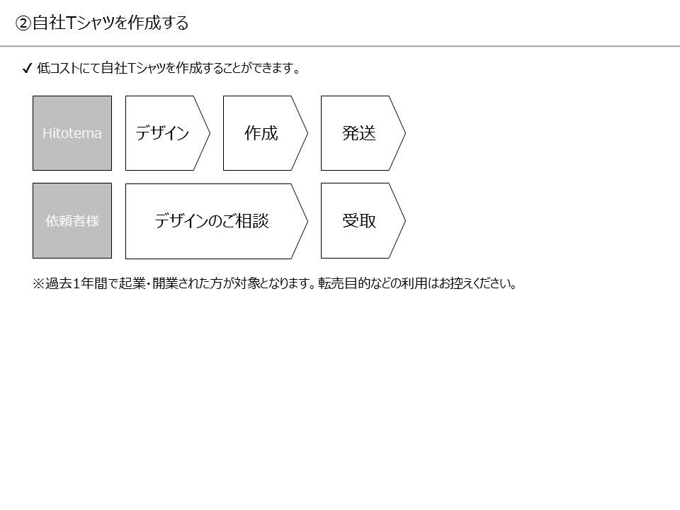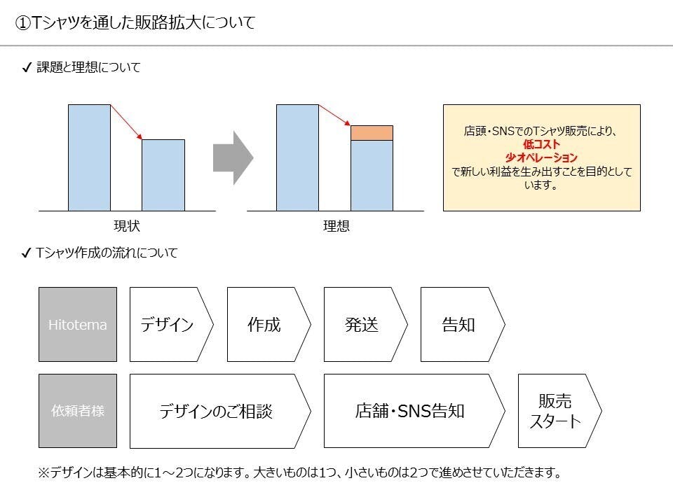 ①Tシャツ販売を通して、販路を拡大し、低コスト・少オペレーションで新たな利益を生み出す