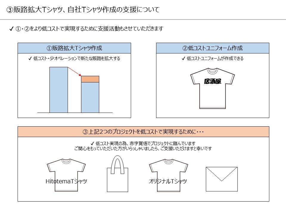 できる限り低コスト化(Tシャツ販売の利益を生み出す、自社Tシャツを安く手に入れる)を実現する為に、ご支援いただけますと幸いです。