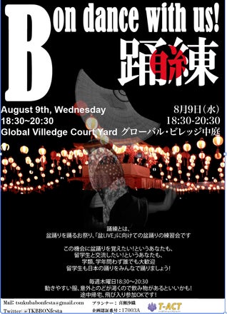こんにちは。 今日はおどれんのご案内です。 盆LIVEにむけた踊りの練習会「おどれん」の11回目です。 お盆前最終回となる今回はグローバルビレッジで開催です。 グローバルビレッジに暮らす留学生だけでなく、留学生・日本人学生・社会人誰でも歓迎です。 本番前に踊れるようになっておけば、盆LIVEがもっと楽しい! 盆LIVE日記もご参照ください。
